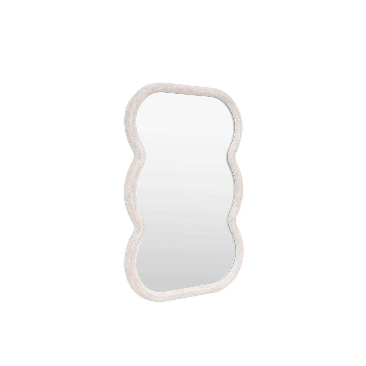 This wall mirror from Gallery Direct will be the focal point of any room. The medium-sized piece is crafted with a wooden frame in a stylish, wavy rectangular shape. A distressed finish gives the design a rustic appearance. This piece can be hung in either landscape or portrait orientation to suit your space.