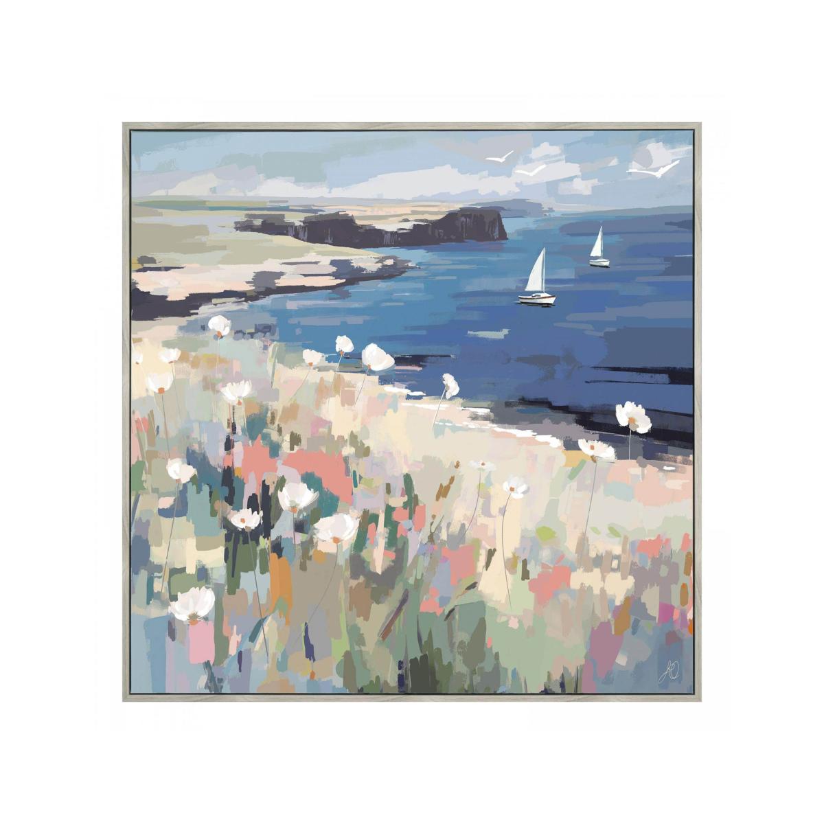 Bring the outdoors inside with this beautiful seascape from Gallery Direct. Using vivid colours, it depicts an immersive coastal scene dotted with flowers, foliage and sailboats. In the distance, seagulls soar high above the clifftops. This large canvas arrives in a stylish frame that makes for easy hanging on your walls.