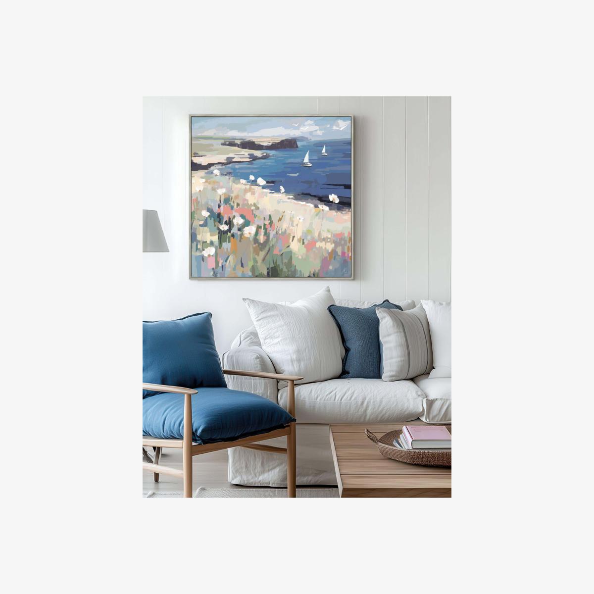 I love this piece for its fresh, coastal-inspired vibe, making it a versatile addition to both contemporary and traditional interiors. It works especially well in living rooms or bedrooms with a light colour palette, adding visual interest without overwhelming the space. For styling, consider pairing it with soft neutrals or shades of blue to create a calming, cohesive look. It also lends itself well to layered displays-try placing it above a neutral sofa, complemented by textured cushions or vases in similar tones. Keep the framing simple, as it allows the artwork to speak for itself, making this canvas a real focal point that effortlessly elevates your space.