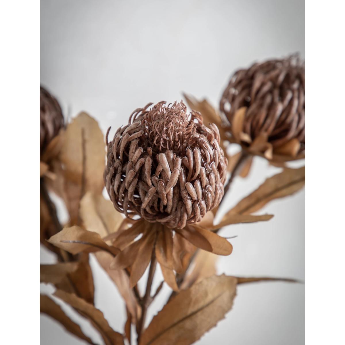 This set of three artificial protea stems from Gallery Home has been carefully crafted to give the authentic look of dried blooms. A striking structural flowerhead combines with delicate fronds of foliage to make a statement addition to any arrangement.