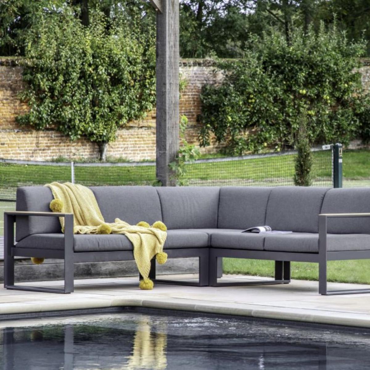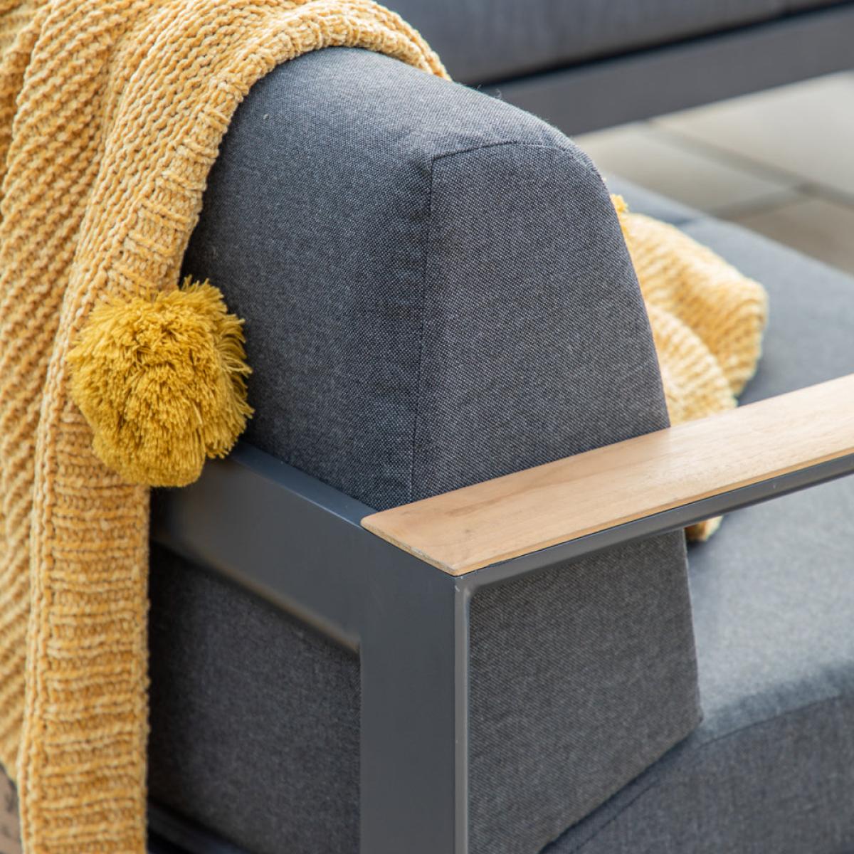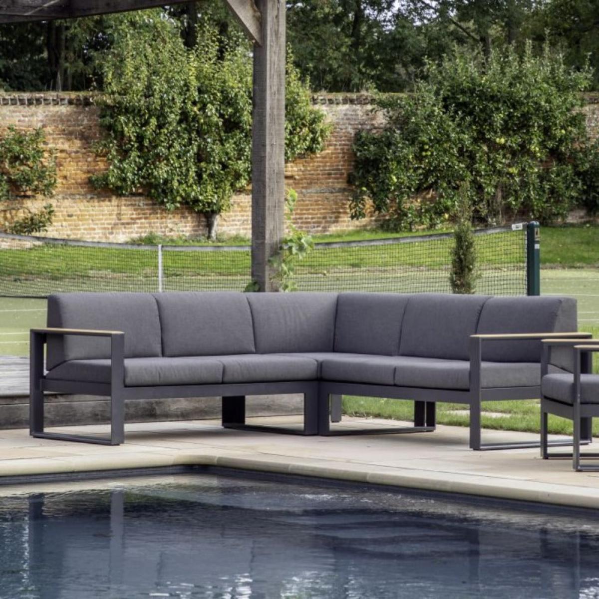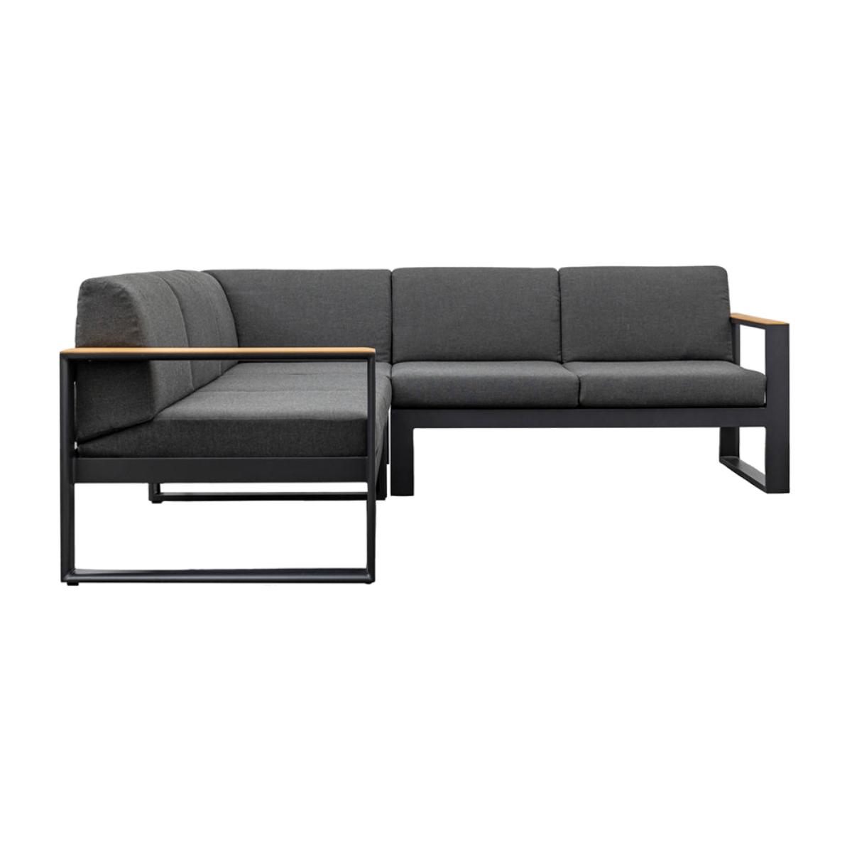 Relax in style and comfort on this stunning contemporary corner sofa which features an aluminium frame with teak trim on the arms to add a lovely styling detail. The cushions are covered in all-weather fabric, which is stain, mould and fade resistant, and are filled with quick drying foam. Dimensions: H: 59 x W: 218 x D: 218 cm Seat Height: 39cm Seat Depth: 78cm Materials: Aluminium, Acrylic fabric, Teakwood, PVC Coated Polyester Assembly Required:Yes Care Instructions: Spot clean only. No harsh abrasives or cleaners Additional Information: We recommend storing outdoor items either under cover or inside during harsh or adverse weather to prolong the life of the product