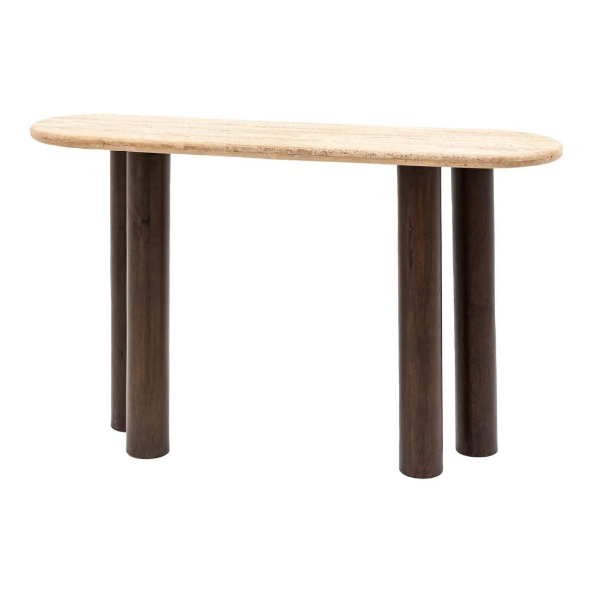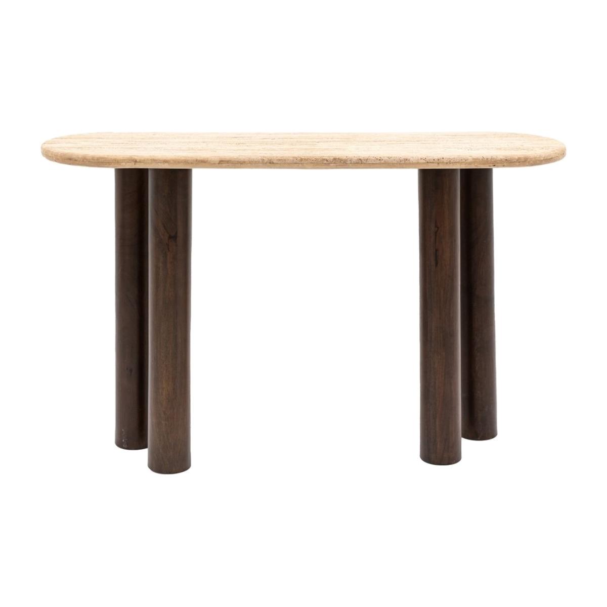 This stunning console table features turned cylindrical legs, crafted from mango wood solids, paired with a solid travertine stone top which has a natural finish. Matching pieces are available. Additional Information
