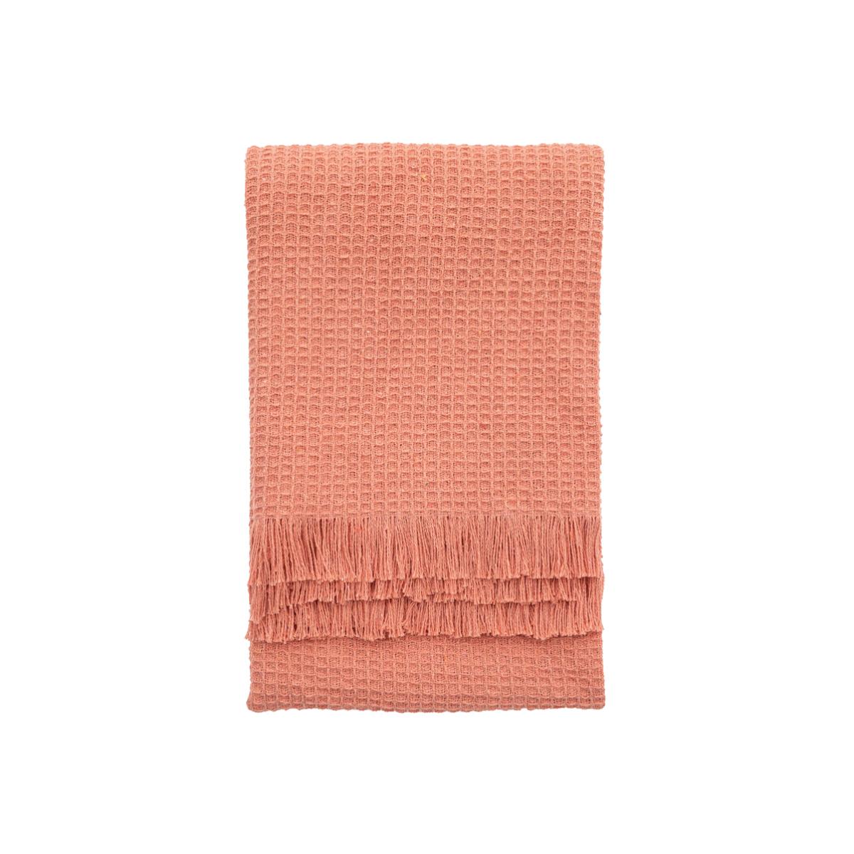 With a large waffle texture and soft fringe detailing, this soft throw will add a cosy feel to any room. The neutral blush tone is designed to suit a variety of interiors. Coordinating cushion cover available. Dimensions: H: 1.6 x W: 130 x D: 180 cm Materials: 60% Cotton, 40% Other Assembly Required: No Care Instructions:Spot clean only. No harsh abrasives or cleaners. Do not hand or machine wash, tumble dry, bleach, dry clean or iron