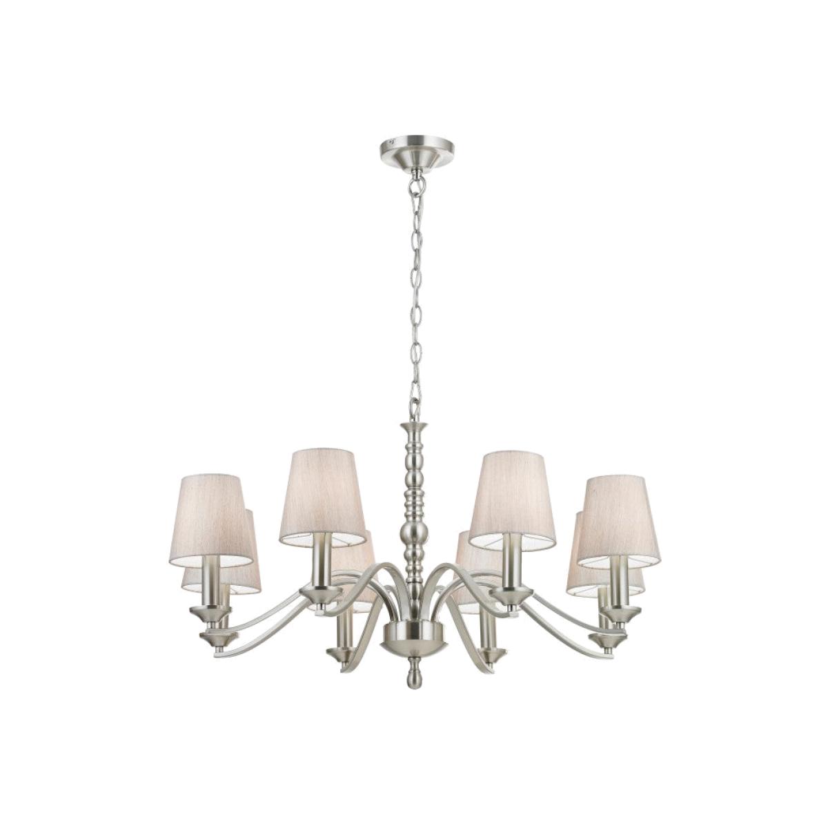 Give your home a look of luxury and style with this stunning Astaire Chandelier from Gallery Interiors. This beautiful chandelier has eight silver-coloured steel arms to take eight bulbs, with each. View More. Give your home a look of luxury and style with this stunning Astaire Chandelier from Gallery Interiors. This beautiful chandelier has eight silver-coloured steel arms to take eight bulbs, with each having a natural cotton shade. Each arm gracefully curves out from an ornately shaped centre pole to create a stylish sophisticated look. This chandelier will make a fantastic focal feature for your room with its elegant timeless classic appeal. Outlet items may show some signs of minor cosmetic imperfections.