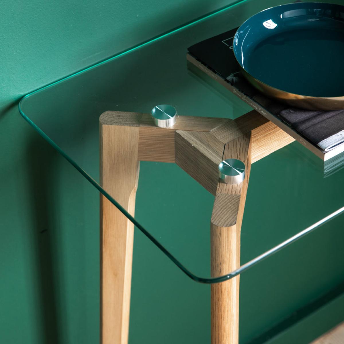 This lovely console table features a beautifully designed solid natural oak base combined with a clear tempered glass top to give a stunning contemporary look. It is part of a collection offering a range of tables, in the natural oak bases paired with clear glass and also with black oak and smoked glass. The tables are part of our Packed-Flat Design Project, offering easy delivery to any room in any property, whilst reducing the packaging needed. Assembly is required, but all the tools needed are supplied. Additional Information