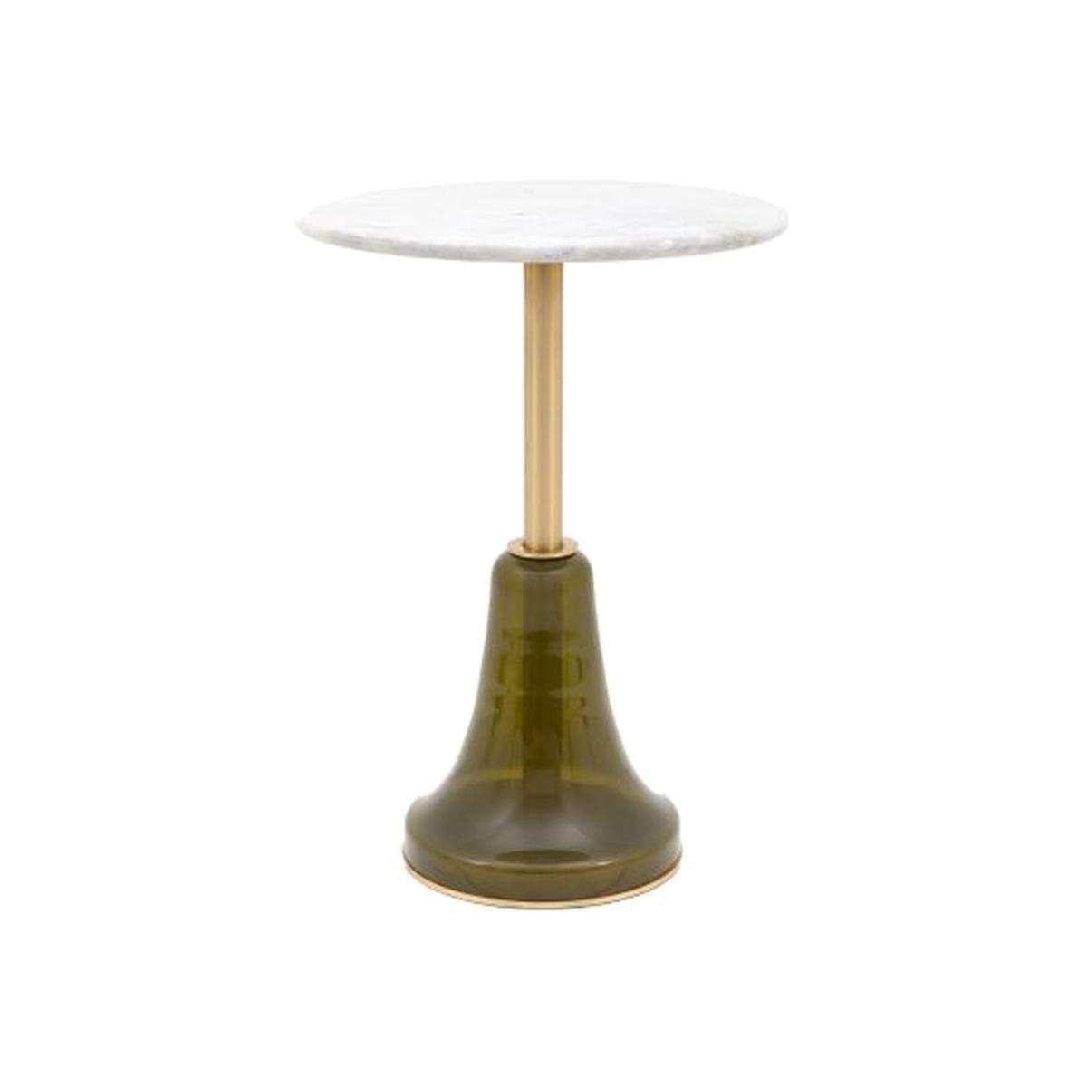 Undeniably a stand out piece of furniture, this luxe side table has a hint of retro styling and a truly unique design. The dusk glass base won't go unnoticed while the metal stem and white marble top add a touch of luxury. Also available with an orange glass base. Dimensions: H:57 x W:46 x D:46cm Materials: Glass 50% / Marble 30% / Aluminium 20% Assembly Required:Yes Care Instructions:Wipe clean with a soft dry cloth - no harsh abrasives