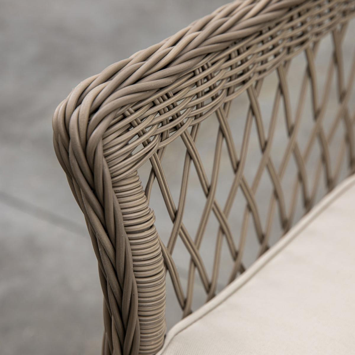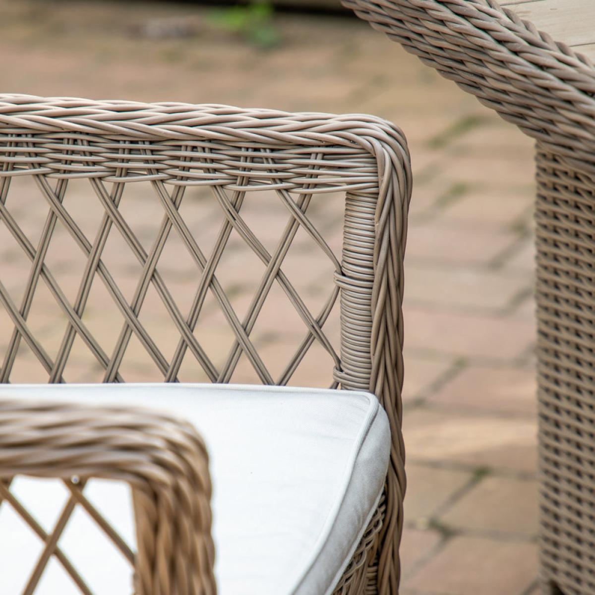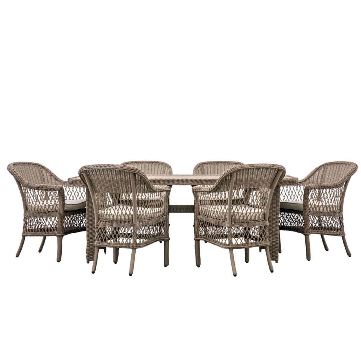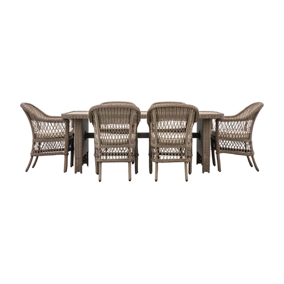 Dine outside in style with this beautiful dining set which features a lovely combination of open and close full rounded weave PE rattan patterns to create elegant style. All the pieces have aluminium frames, the chairs have showerproof cushions and the table has a plywood plank top. A matching lounge set is also available. Dimensions:Table W:200 x D:100 x H:75cm / Chair W:61 x D:64 x H:88cm Materials: Aluminum, Wicker, Polyester Assembly Required:Yes Care Instructions: Spot clean only. No harsh abrasives or cleaners Additional Information: We recommend storing outdoor items either under cover or inside during harsh or adverse weather to prolong the life of the product