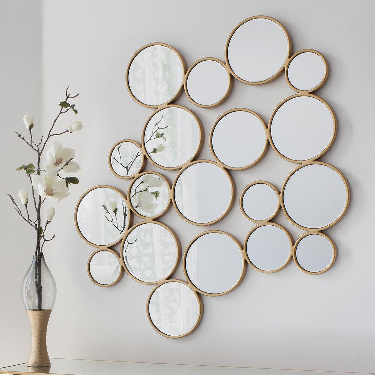 The stylishly designed Gallery Interiors Camilla gold-framed wall mirror will have an instant impact on any room in your home. Integrating 19 separate yet interconnected multi-sized mirrors, each. View More. The stylishly designed Gallery Interiors Camilla gold-framed wall mirror will have an instant impact on any room in your home. Integrating 19 separate yet interconnected multi-sized mirrors, each surrounded by a gold-edged finish, this mirror instantly creates space light and interest. If placed near a lamp or candle, the dancing light reflected from this multi-faceted mirror will add dimension and an unusual feature to your room. Place it in an entrance hallway to tantalise your guests as they enter; alternatively, use it as a feature in your lounge or dining room. The dimensions are 118cm high, 101cm wide and 25cm deep.
