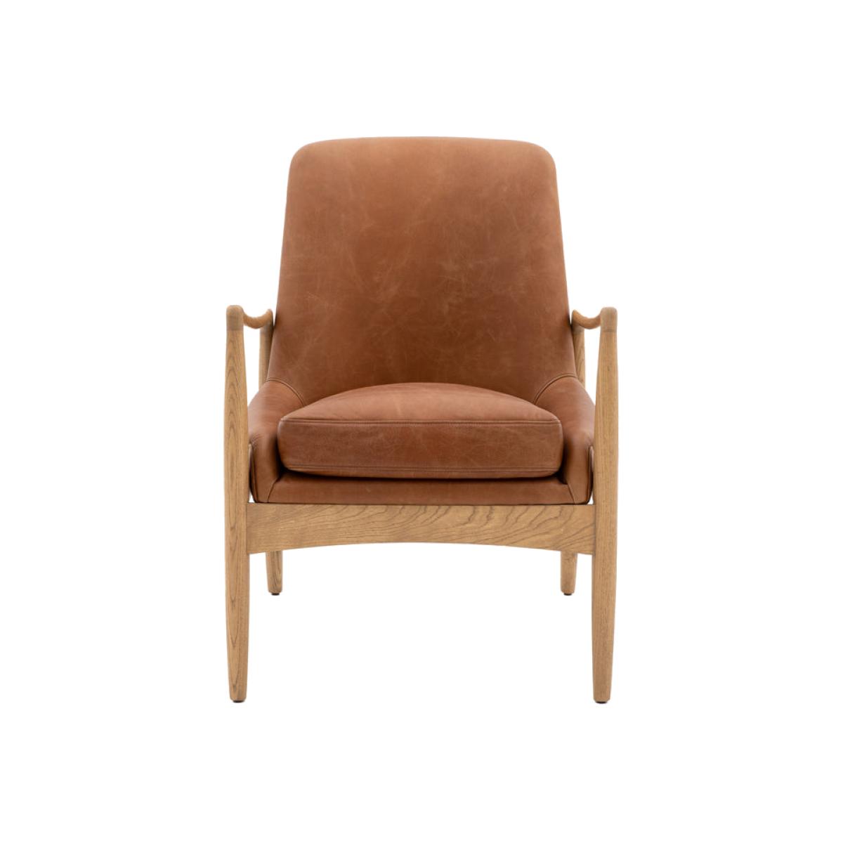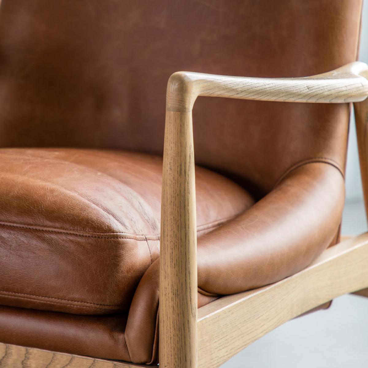 Offering an contemporary twist on mid-Century style, this beautiful chair will suit a wide range of interiors. The oak frame with its natural weathered finish is perfectly complementd by the brown leather. The padded back and seat cushion adds extra comfort to the chair. Dimensions: H: 82 x W: 68.5 x D: 72 cm Materials: Ash, Plywood, Leather, Foam, Polyfibre Assembly Required: No Care Instructions: Spot clean only. No harsh abrasives or cleaners