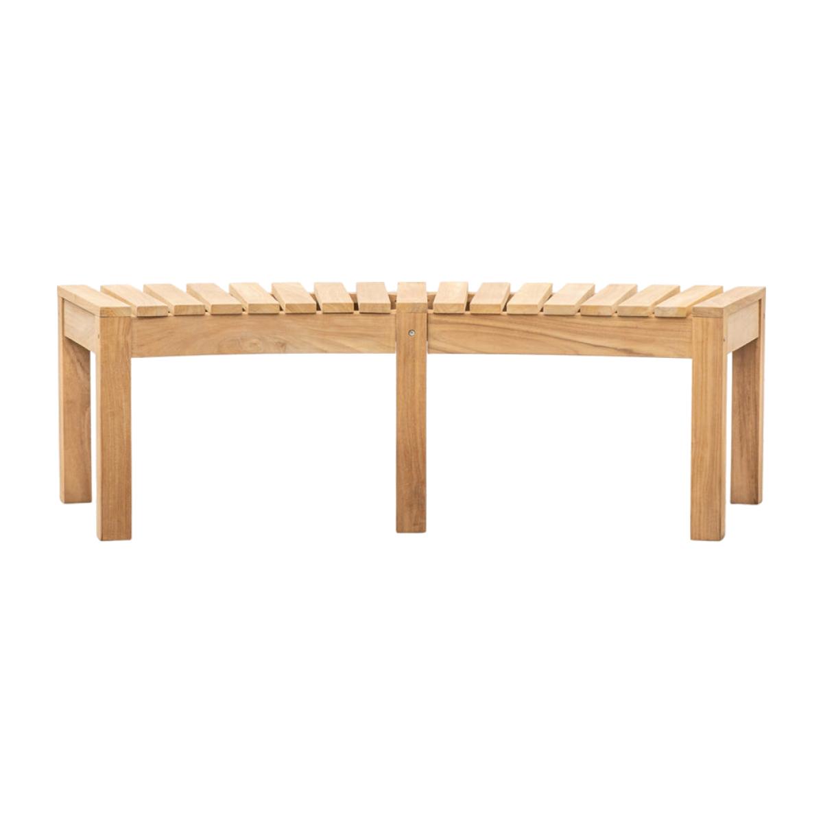 Designed to work perfectly with our oval teak dining table, this bench echoes the curve of the table top. However, it looks equally good used as a standalone bench. It is crafted from teak, which is an ideal material for outdoor furniture because of its incredible durability and water resistance. A matching bench with a back is also available. Dimensions: H: 63 x W: 148 x D: 45 cm Materials: Teak Assembly Required:Yes Care Instructions:Wipe clean with a damp cloth. Dry with a soft clean cloth Additional Information: We recommend storing outdoor items either under cover or inside during harsh or adverse weather to prolong the life of the product