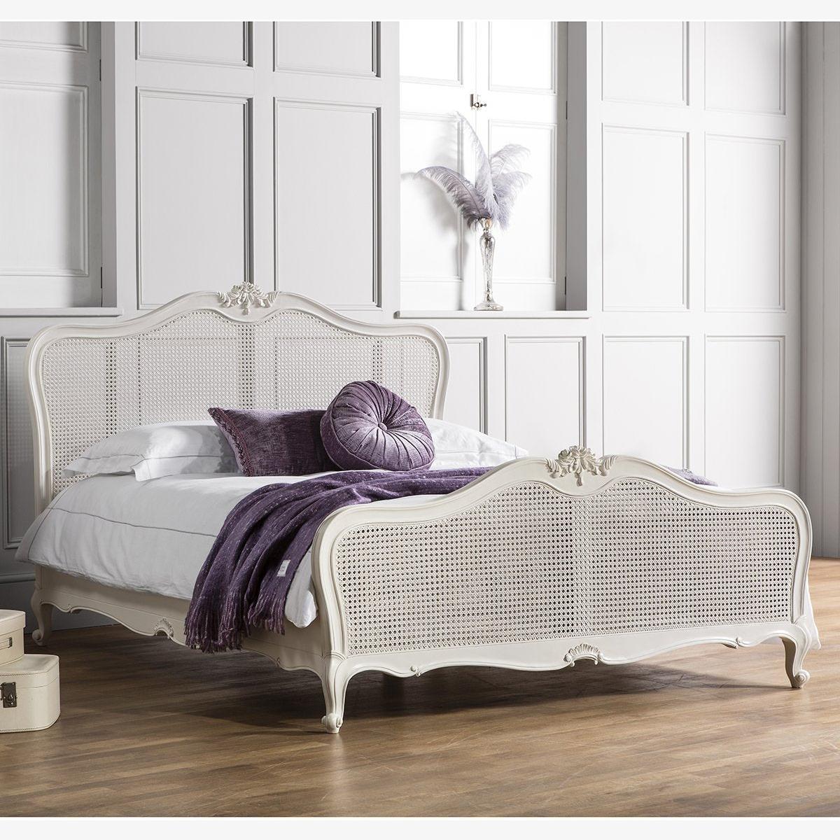 Chic Cane King Size Bed in Off White, from Olivia's. Effortlessly transform your boudoir with the Chic Cane King Size Bed. French-inspired in design, its elegant structure and materials give beautiful detailing across the headboard and foot of the bed. The centrepiece of any beautiful bedroom should feature a gorgeous bed as the focal point. Made of weathered wood in an Off White finish, the hand-carved detail give a fabulous touch to complete the look. Dimensions:W:168 x D:215 x H:129 cm. Material: Cane, MahoganyNotes:. Footboard height: 75cm. Under bed storage height: 28cm