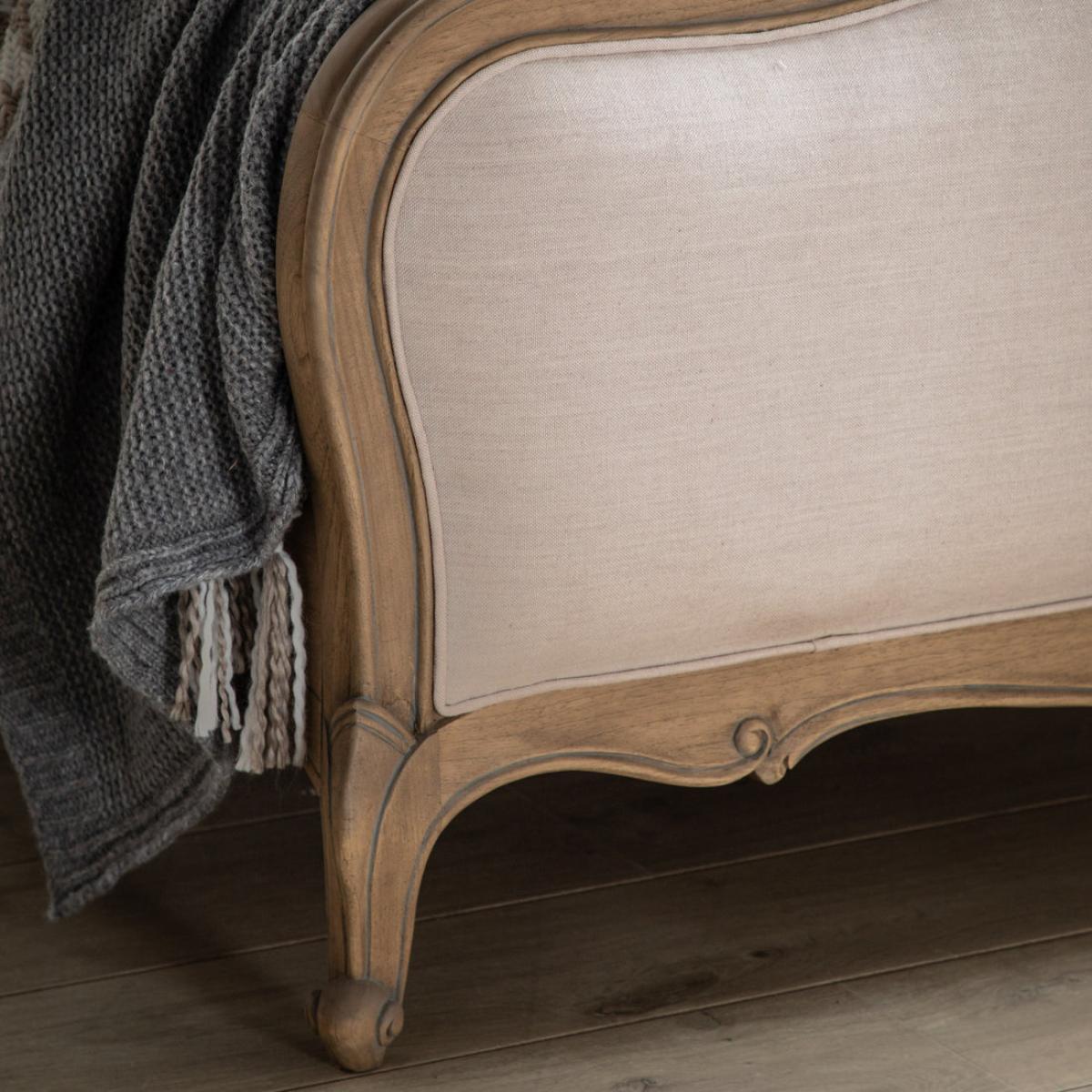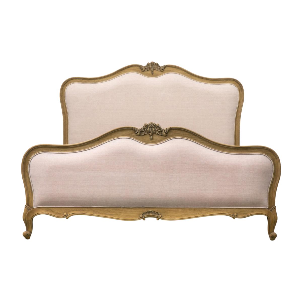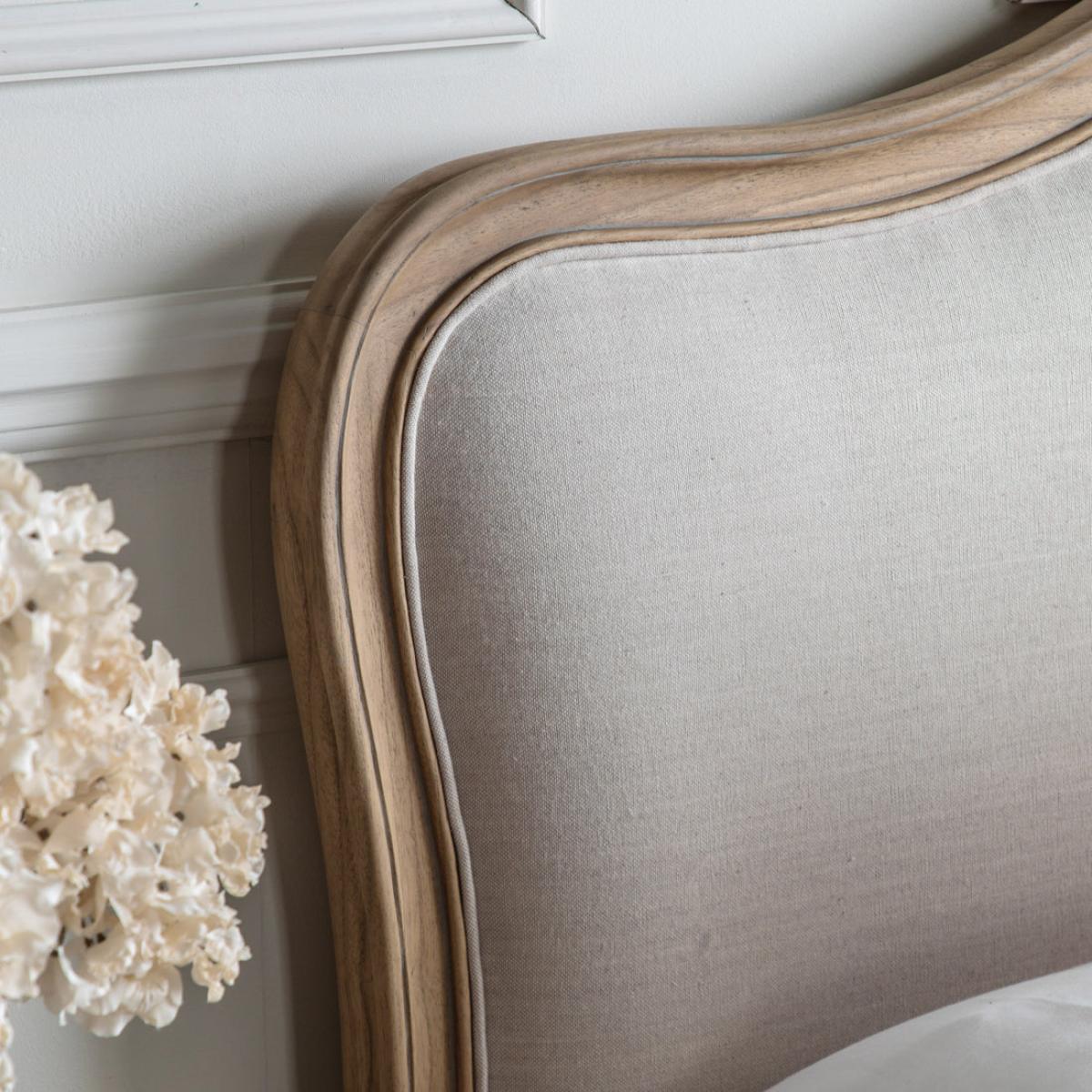 Chic King Size Linen Upholstered Bed in Weathered Wood, from Olivia's. Effortlessly transform your boudoir the Chic Cane King Size Bed. French-inspired in design, its elegant structure and materials give beautiful detailing across the headboard and foot of the bed. The centrepiece of any beautiful bedroom should feature a gorgeous bed as the focal point. Made̴ with weathered wood finish with a natural cotton linen upholstery, the hand-carved detail give a fabulous touch to complete the look. Dimensions: W:168 x D:215 x H:129 cm. Material: Linen, Mindy Ash Footboard height: 75cm. Under bed storage height: 28cm