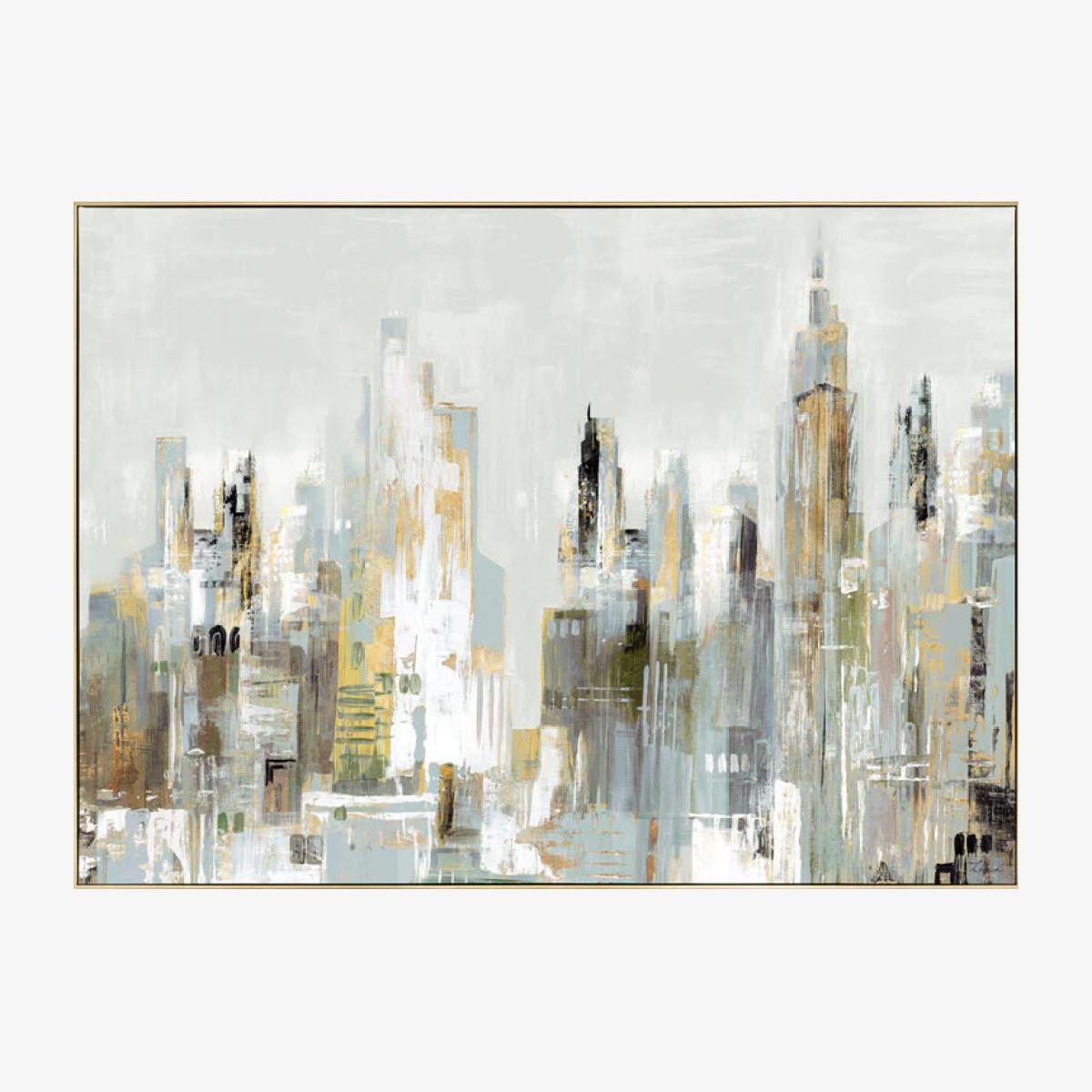 Behold a majestic skyline adorned with a diverse collection of architectural wonders. The abstract canvas unfolds in neutral tones, creating a bustling cityscape. Textured gold foil embellishments uplift the spirit of the city, adding a touch of opulence. Against a calming sky, this artwork juxtaposes the dynamic energy of urban life. Additional Information: Frame Width: 2.8cm Frame Colour:Black and gold Frame Material: Extruded Polyurethane and Pine Frame Dimensions:H:88 x W:122 x D:3.5cm Materials: PS, Canvas, Pine Assembly Required:Yes - Hanging Care Instructions:Dust the frame with a soft cloth or feather duster. Do not use glass cleaner as this could damage the frame finish.