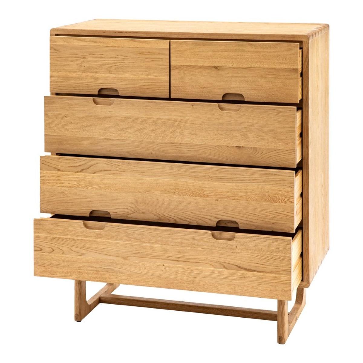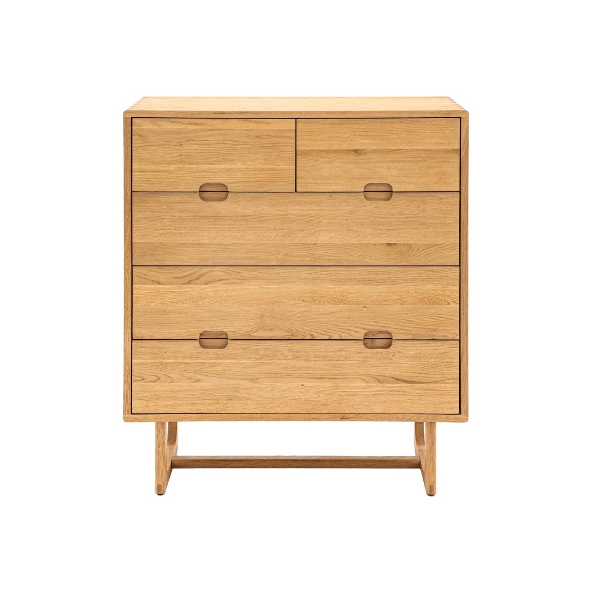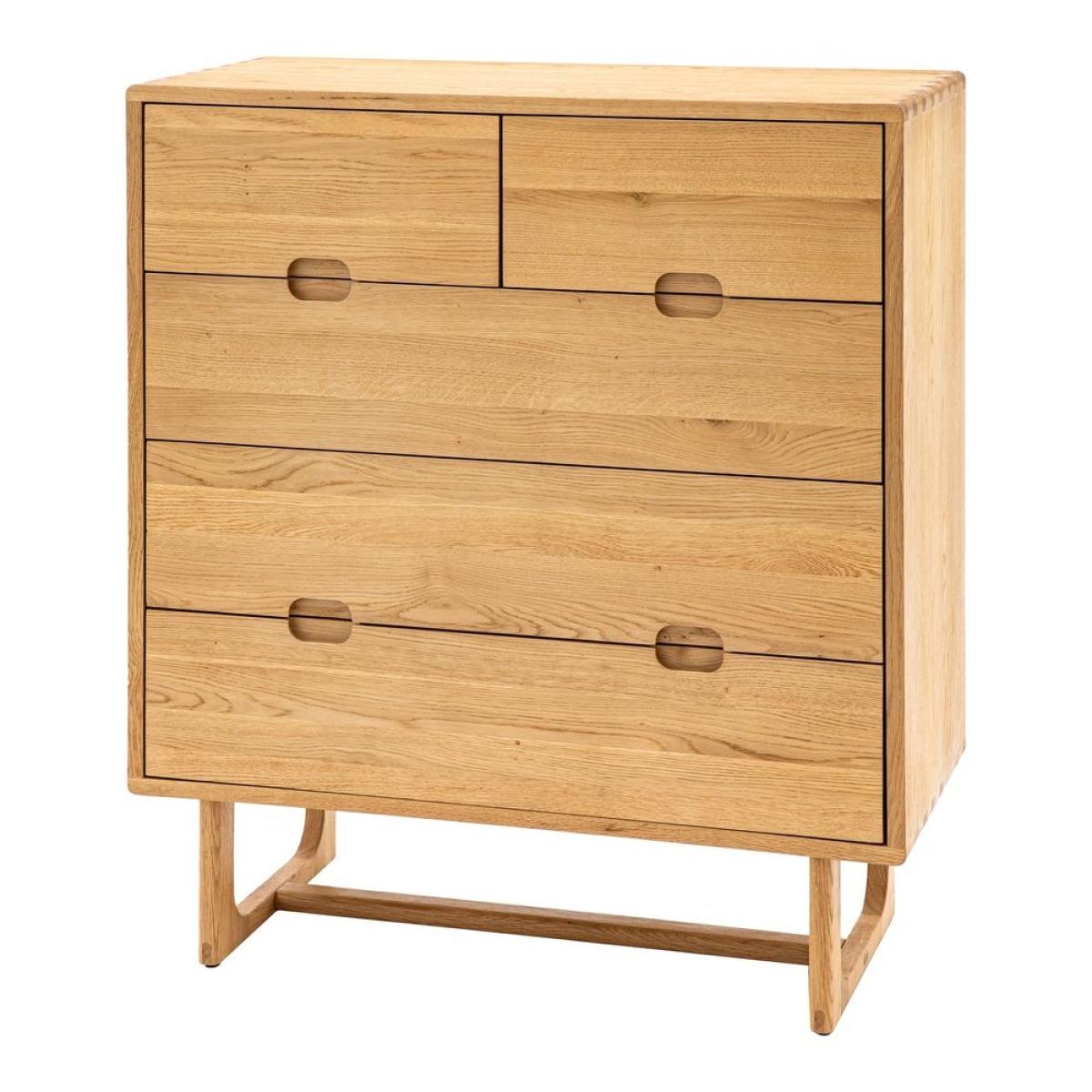 With its cut-out handles on the drawers and beautifully shaped underframe, this lovely chest of drawers offers stunning design. It is crafted from the finest oak and oak structural veneers where practical, with a lovely natural finish. Dovetail joints on the drawers and finger joints on the corners of the piece, techniques found on high quality cabinetry, give strength and a sense of purpose and tradition to create long-lasting, legacy furniture that can be collected and handed down through generations. Matching pieces available. Additional Information: Storage: 5 Draws Clearance to Floor: 20cm Leg Height: 20cm Dimensions: H:106 x W:95 x D:45cm Materials: MDF Veneer Oak 50% / Oak 30% / Pine 20% Assembly Required: Yes Care Instructions:Wipe clean with a soft dry cloth - no harsh abrasives