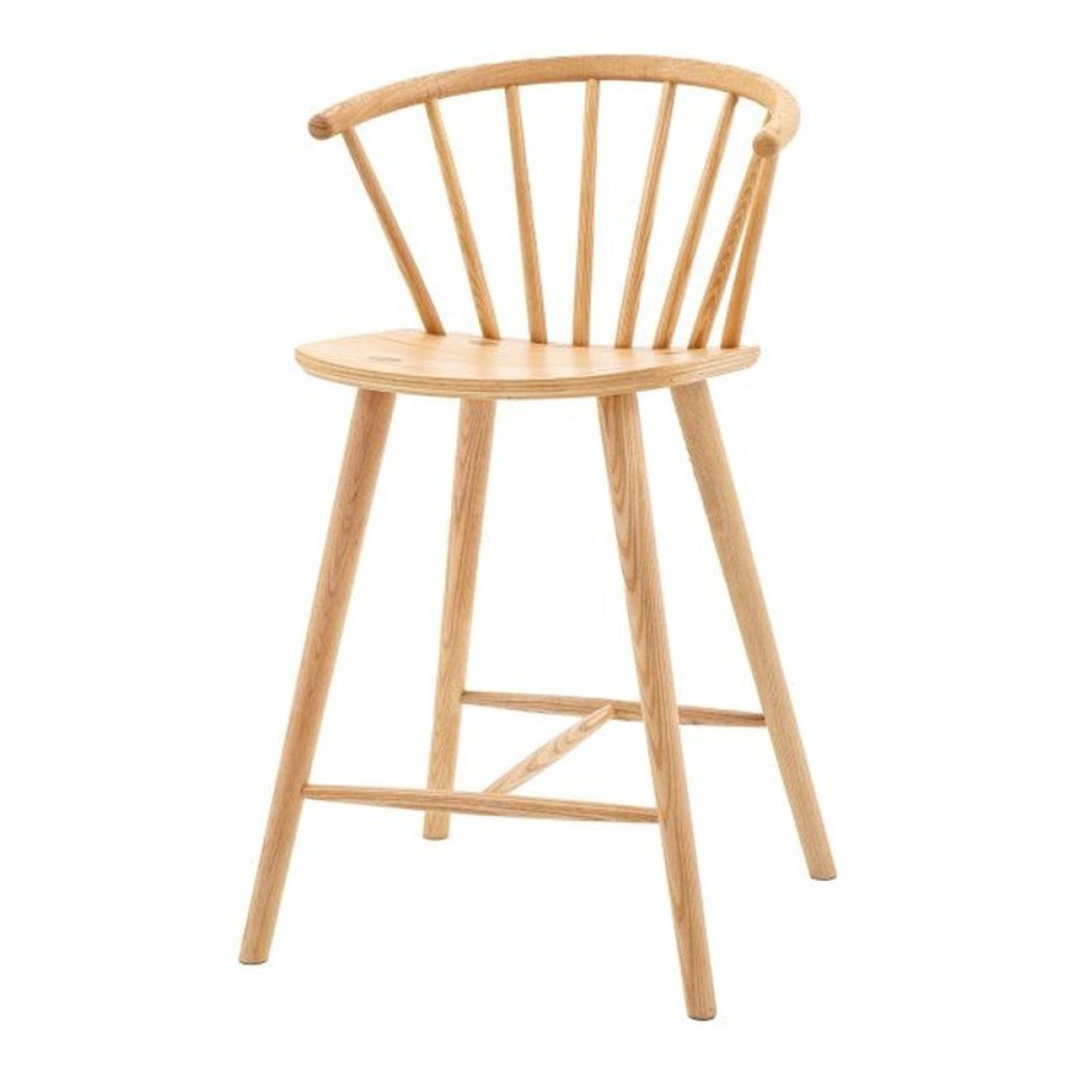 This stylish barstool features elegant turned legs and back spindles and a gently shaped seat. The wood has a lovely natural finish. The stool is also available in a mocha finish. Matching and coordinating pieces available. Additional Information: Seat Width between arms: 45cm Seat Depth: 45cm Leg Height: 62.4cm Dimensions: H:95 x W:53 x D:52cm Materials: Oak 85% / Oak Vaneer MDF 15% Assembly Required: Yes Care Instructions:Wipe clean with a soft dry cloth - no harsh abrasives