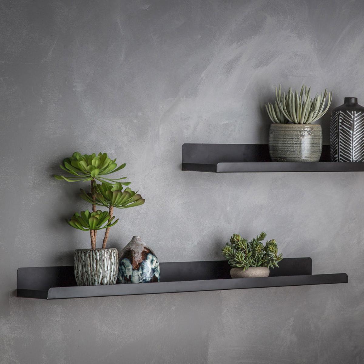 The Gallery Interiors Crofton wall shelf is wonderfully minimalistic, courtesy of its scaled back design and classy monochrome colour palette. The shelf is dark silver, ensuring it of a sophisticated look that will suit any décor. The shelf would be perfect in a lounge or dining area, perhaps showing off a set of ornaments or framed photographs. With its unassuming yet refined aesthetic, it will never overshadow its contents, and retain an intriguing allure of its own. A raised lip around the front and side of the shelf protects valuables from falls and possible breakages. This piece comes in large and small sizes. Dimensions:L: W: 90 x D: 15 x H: 7 cm S: W: 60 x D: 15 x H: 7 cm