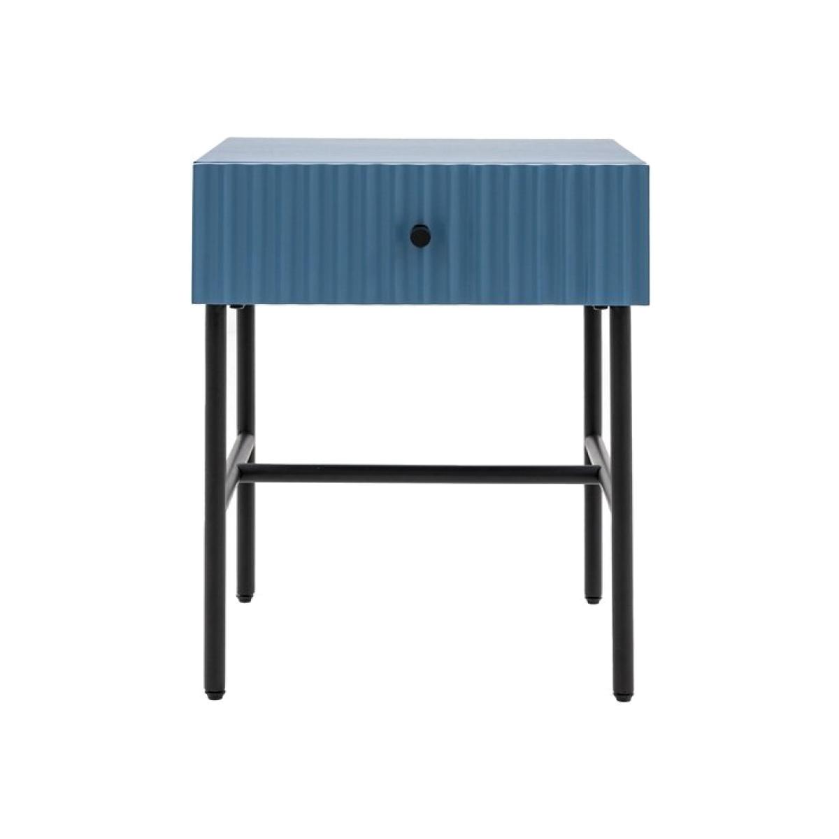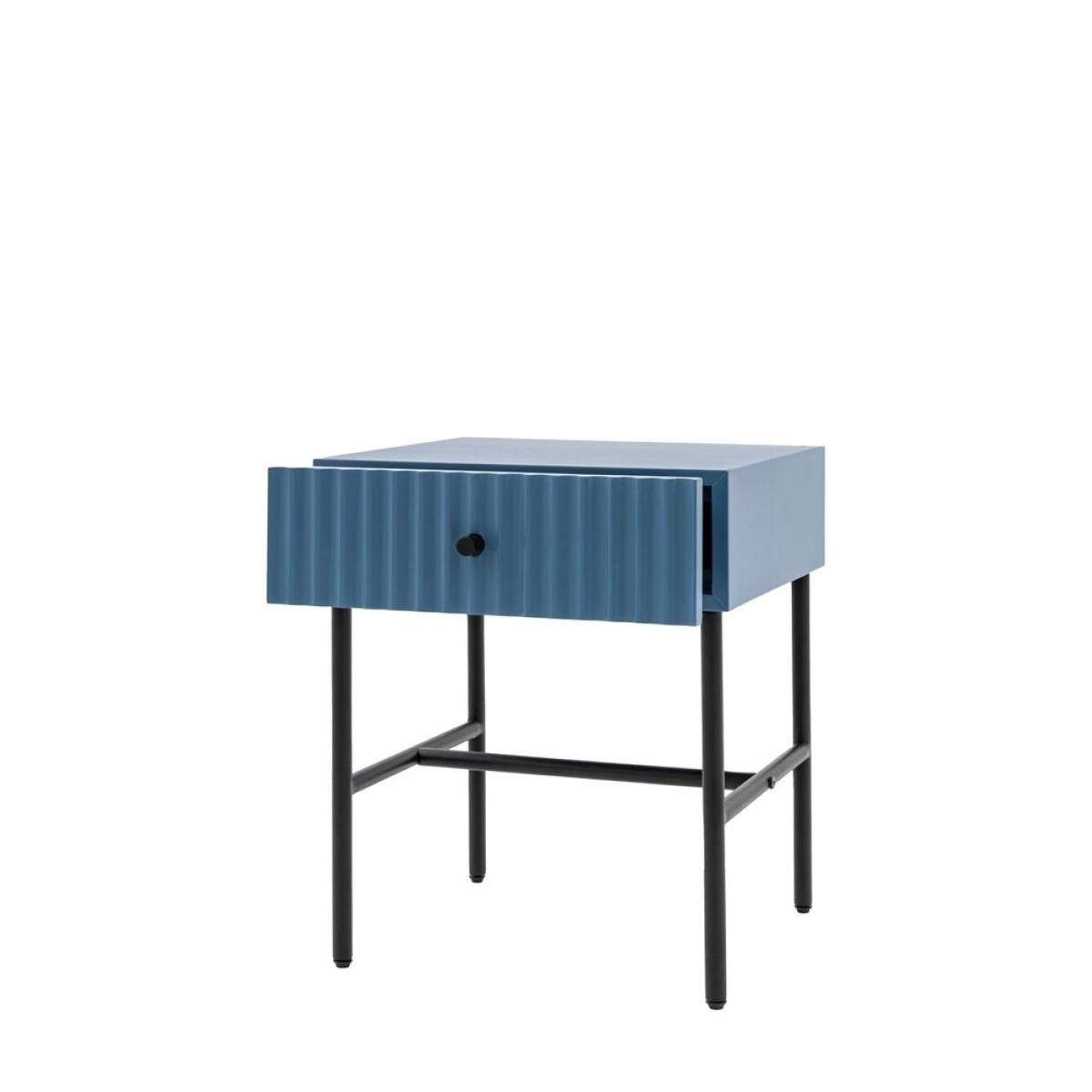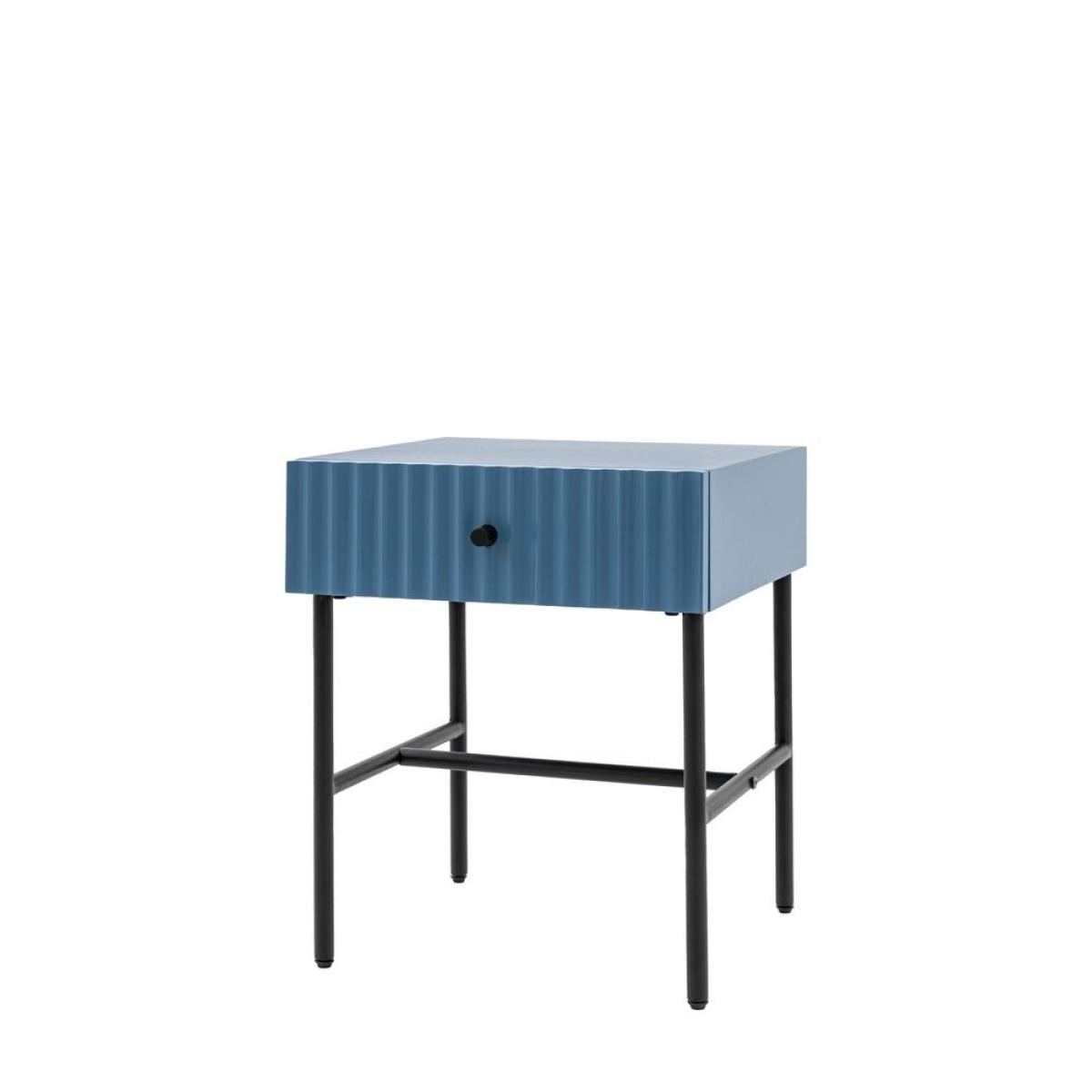 This lovely bedside, in a painted blue finish, features a lovely drawer fascia which has a stylish vertical scalloped design, giving a unique upmarket look. Black metal legs, underframe and handle complete the look, whilst the drawer gives added practicality. Perfect for any contemporary apartment interior, the bedside would equally at home in a wide range of interiors. Matching pieces available. Also offered in grey and white. Additional Information