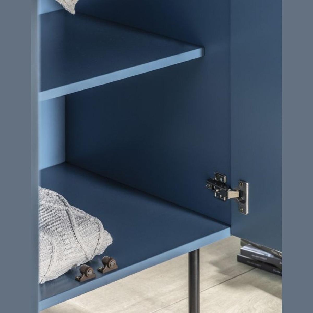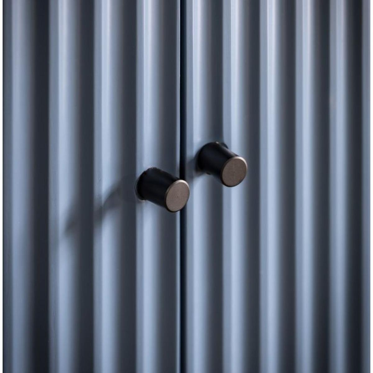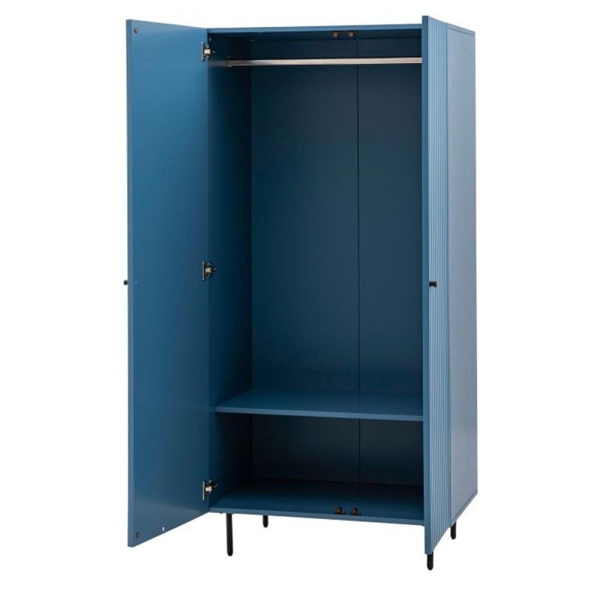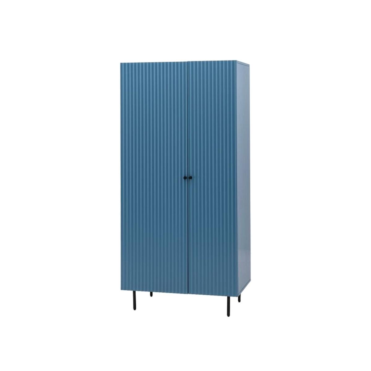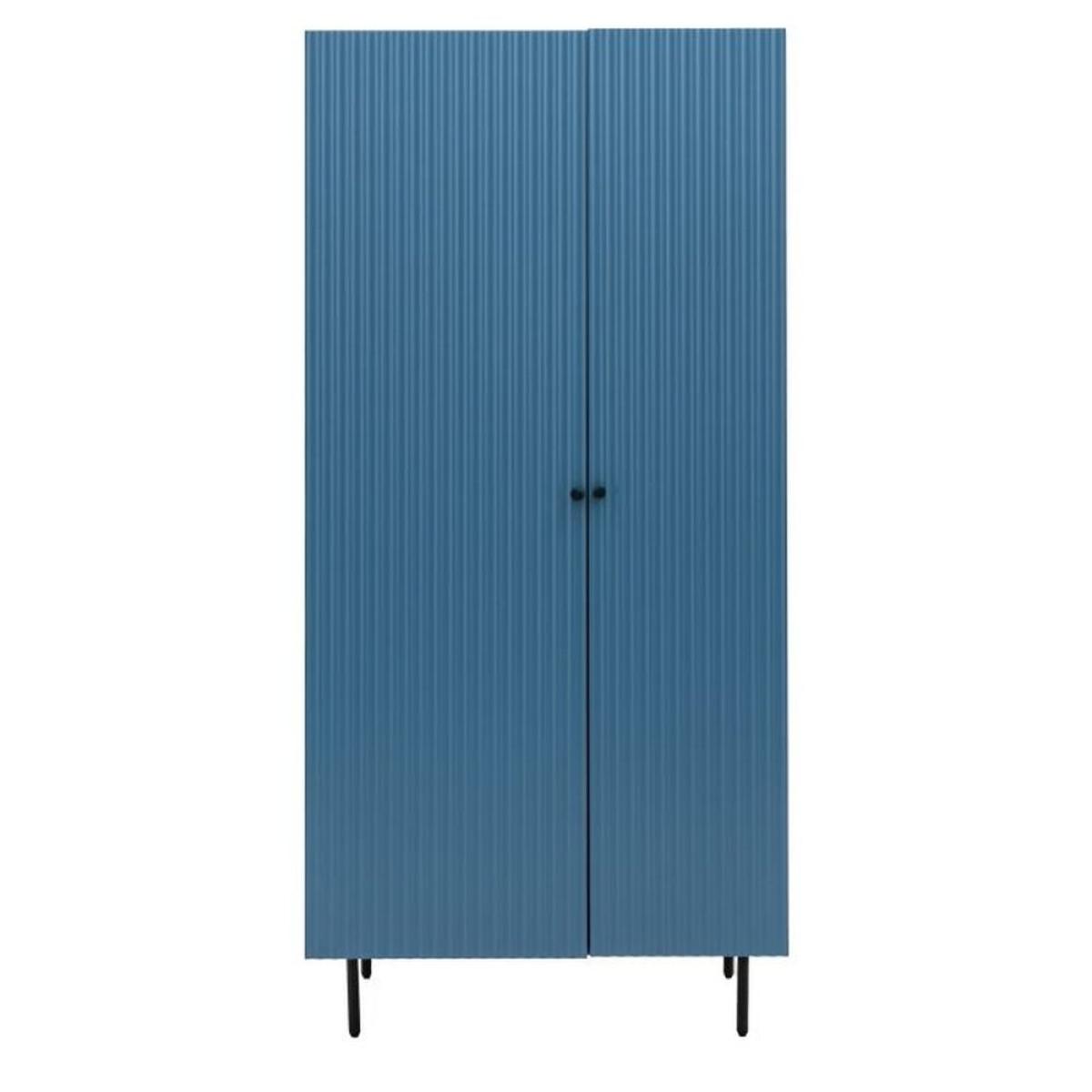 Featuring lovely door fronts with a stylish vertical scalloped design, giving a unique upmarket look, this contemporary wardrobe has a blue painted finish. Black metal legs and handles complete the look. Perfect for any contemporary apartment interior, the wardrobe would equally at home in a wide range of interiors. Matching pieces available. Also offered in white and grey. Additional Information