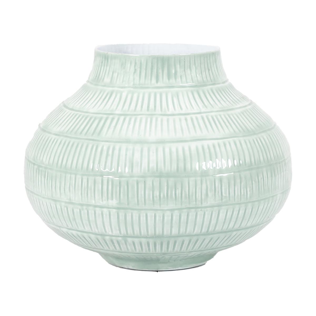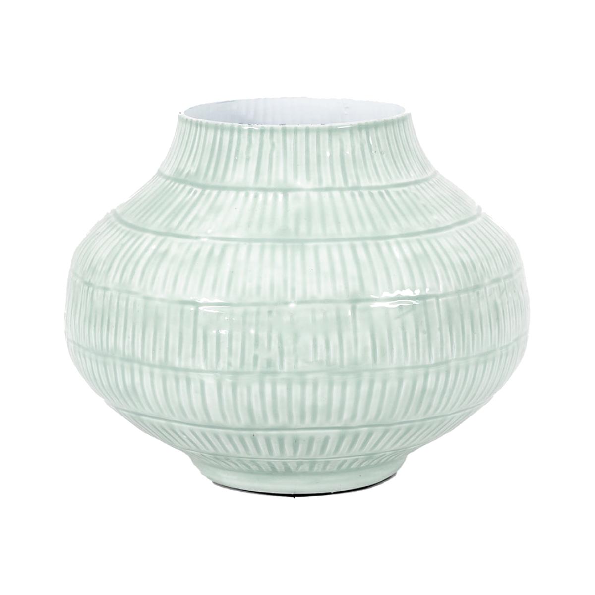 This vase's softly rounded shape is highlighted by a pale green colour and a distinctive linear textured pattern, creating a beautiful and intriguing vase. Coordinating pieces available. Dimensions: Small - H: 16 x W: 19 x D: 19 cm Large - H: 19.5 x W: 24 x D: 24 cm Materials: Iron Assembly Required: No Care Instructions: Clean with a soft dry cloth