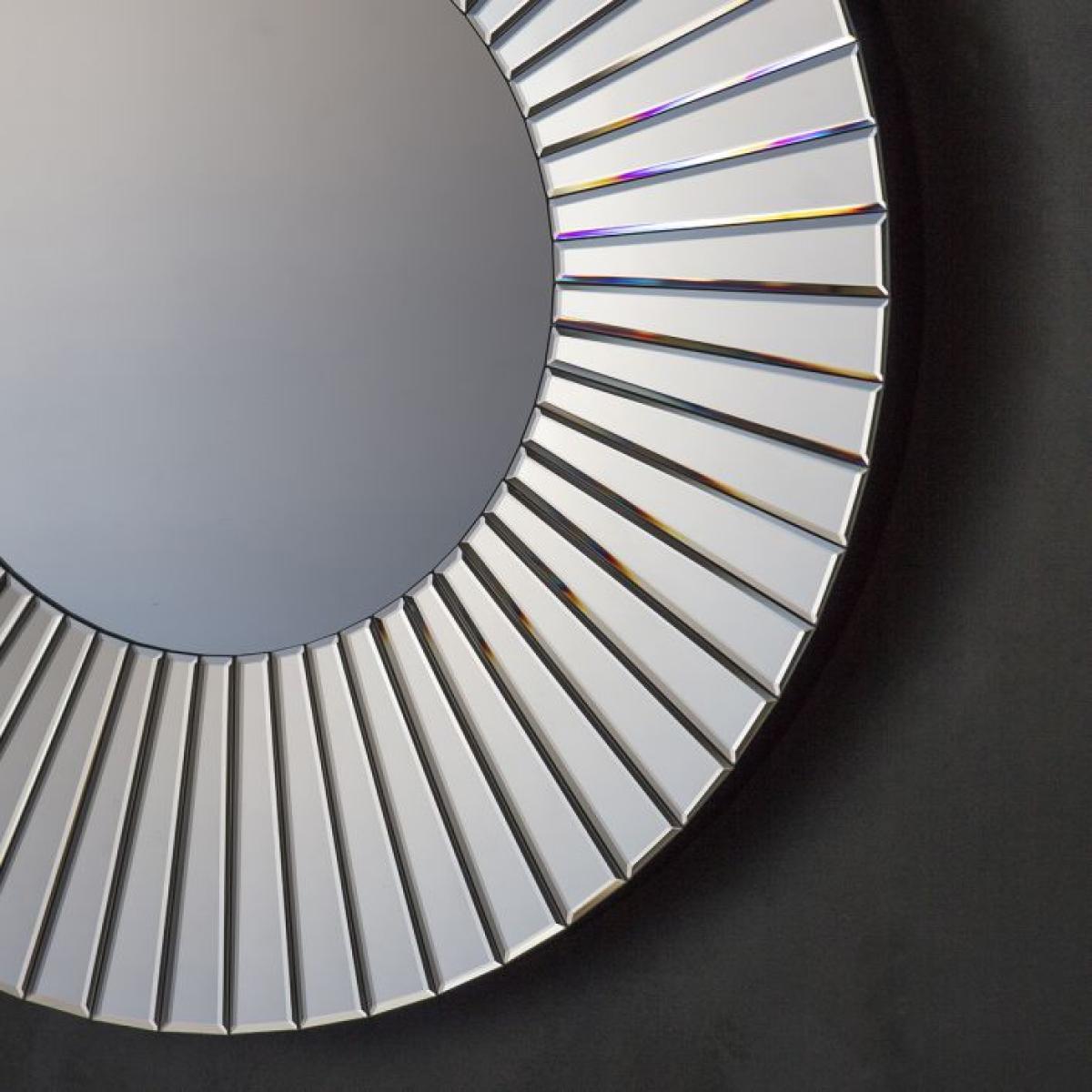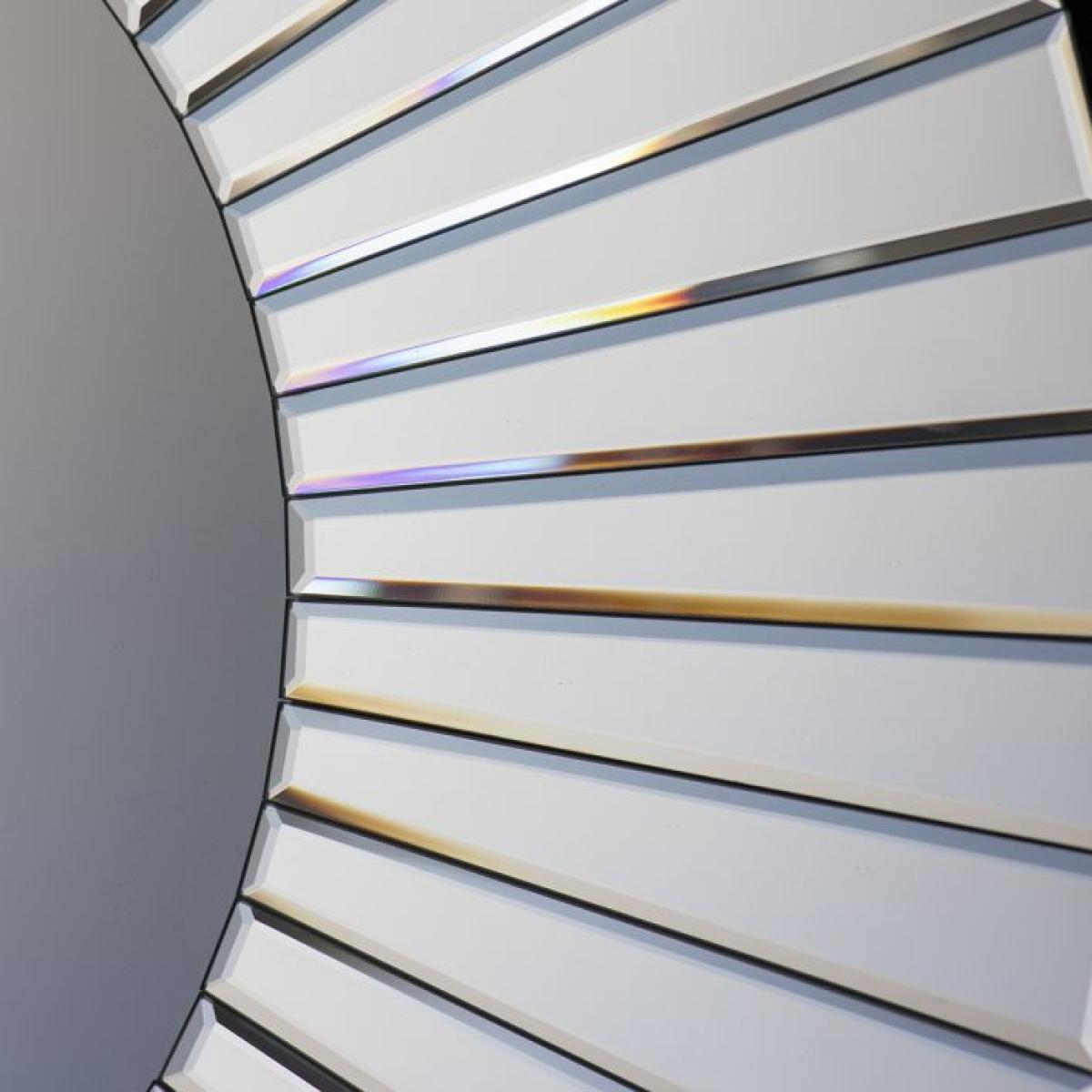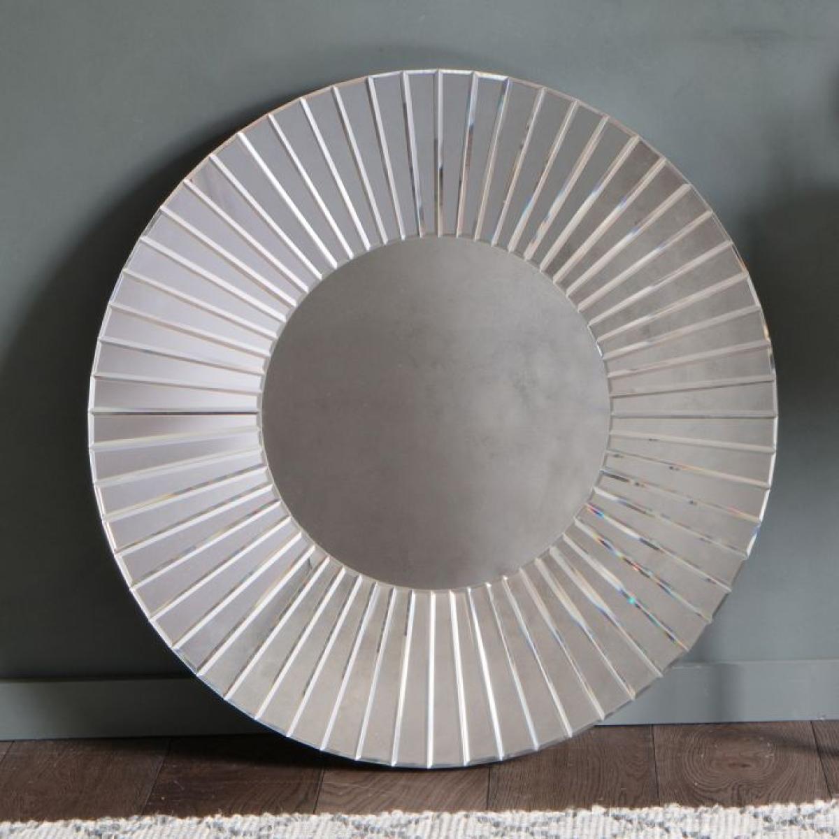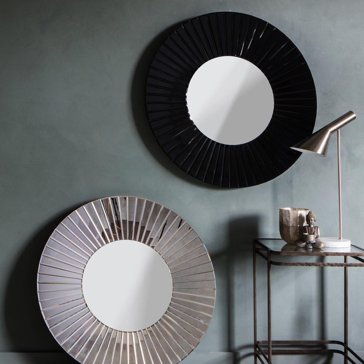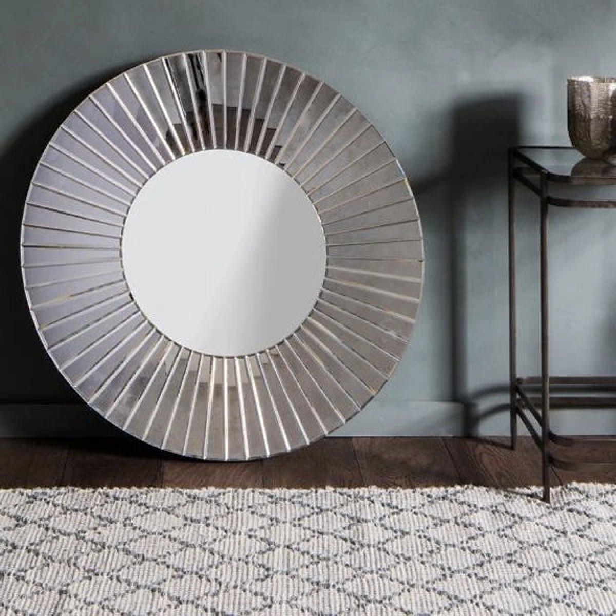 Add the perfect finishing touch to your room with this stunning Faxton mirror from Gallery Interiors. The mirror has a circular central mirror and is framed by strips of mirrors with bevelled edges, to create the look of a large, mirrored flower. This is perfect for the hallway, lounge, bedroom, or dining room. It’s great to make sure you’re looking your best. Mirrors also help a room seem bigger as they reflect the light in the room to create the illusion of extra space. This mirror measures 80cm wide and 80cm high. This versatile silver mirror will suit a number of interior design styles. Dimensions:W:80 x D:5 x H:80 cm Materials: Glass, MDFOrientation: Portrait. Fixing Type: D-Ring. Notes: The edge of this mirror when viewed from side on it black