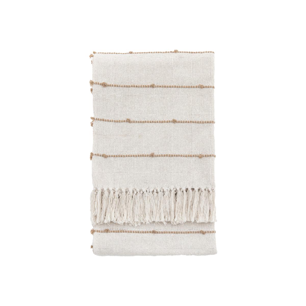 In a neutral grey tone, this soft throw features textured line detail in a pale brown tone and soft fringe detailing, perfect for adding a little cosy style to your room. Coordinating cushion cover available. Dimensions: H: 1.6 x W: 130 x D: 180 cm Materials: 60% Cotton, 40% Other Assembly Required: No Care Instructions:Spot clean only. No harsh abrasives or cleaners. Do not hand or machine wash, tumble dry, bleach, dry clean or iron