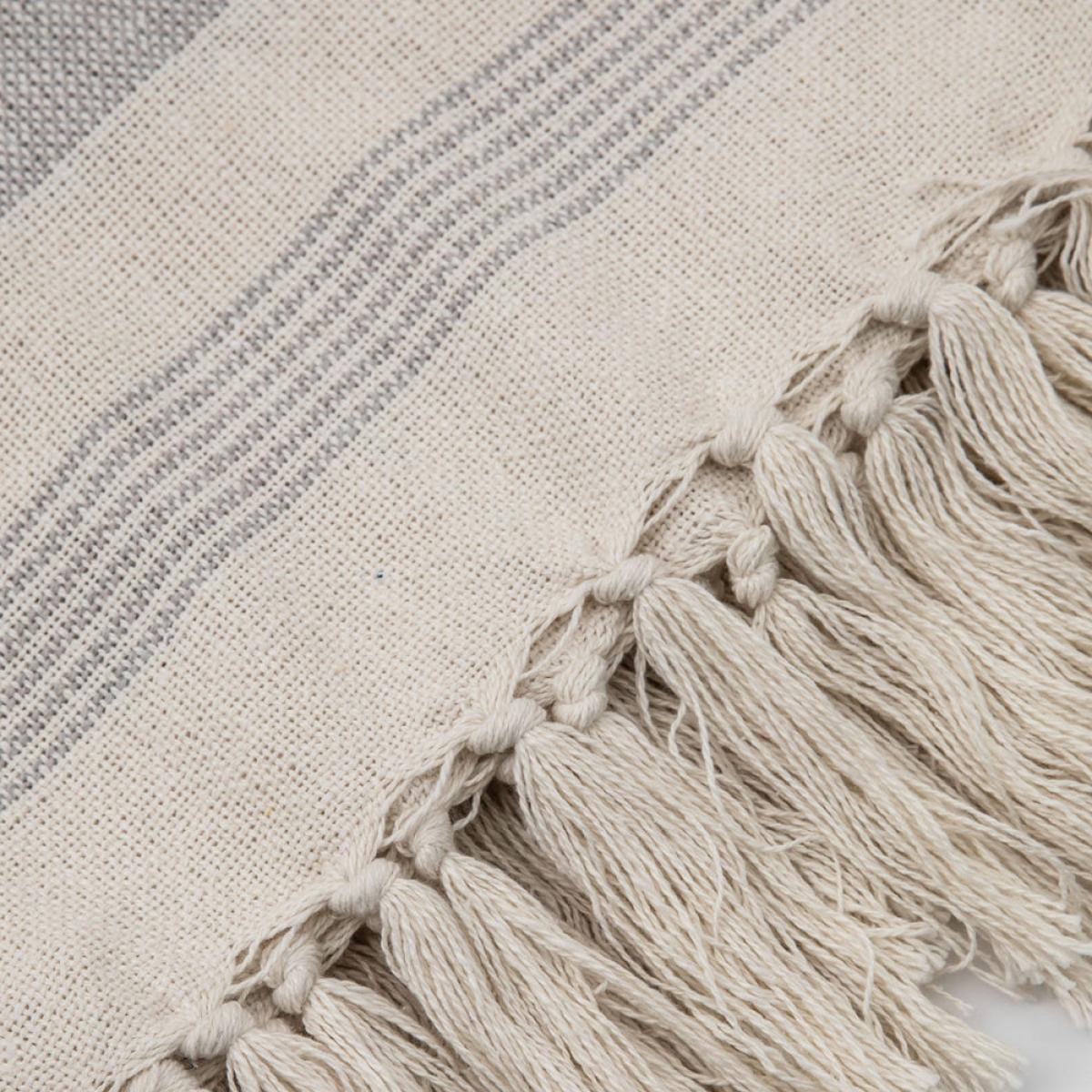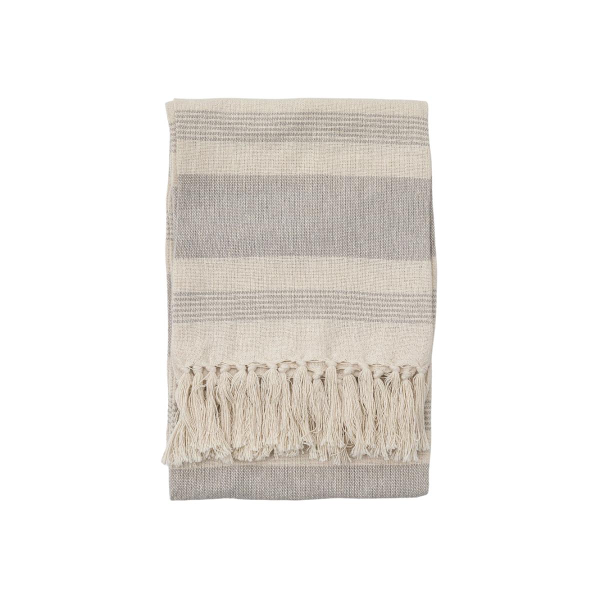 Tastefully understated, the Gallery Interiors Garnette Stripe throw in taupe is made from exquisite organic cotton and impeccably finished with knotted tassels at the ends. A chic throw like this is extremely versatile, adding a touch of pared back luxe. It can be draped over a sofa or chair to add comfort and style. The distinctive weave of the throw features a subtly contrasting pattern of grey bands and grey stripes to add visual interest. Measuring 130cm by 170cm, the generous proportions mean it can be used in a variety of situations. The beautifully muted colours will seamlessly complement a range of interior palettes. Outlet items may show some signs of minor cosmetic imperfections Dimensions: H: 5 x W: 130 x D: 170 cm Materials: Polyester/Cotton Assembly Required: No