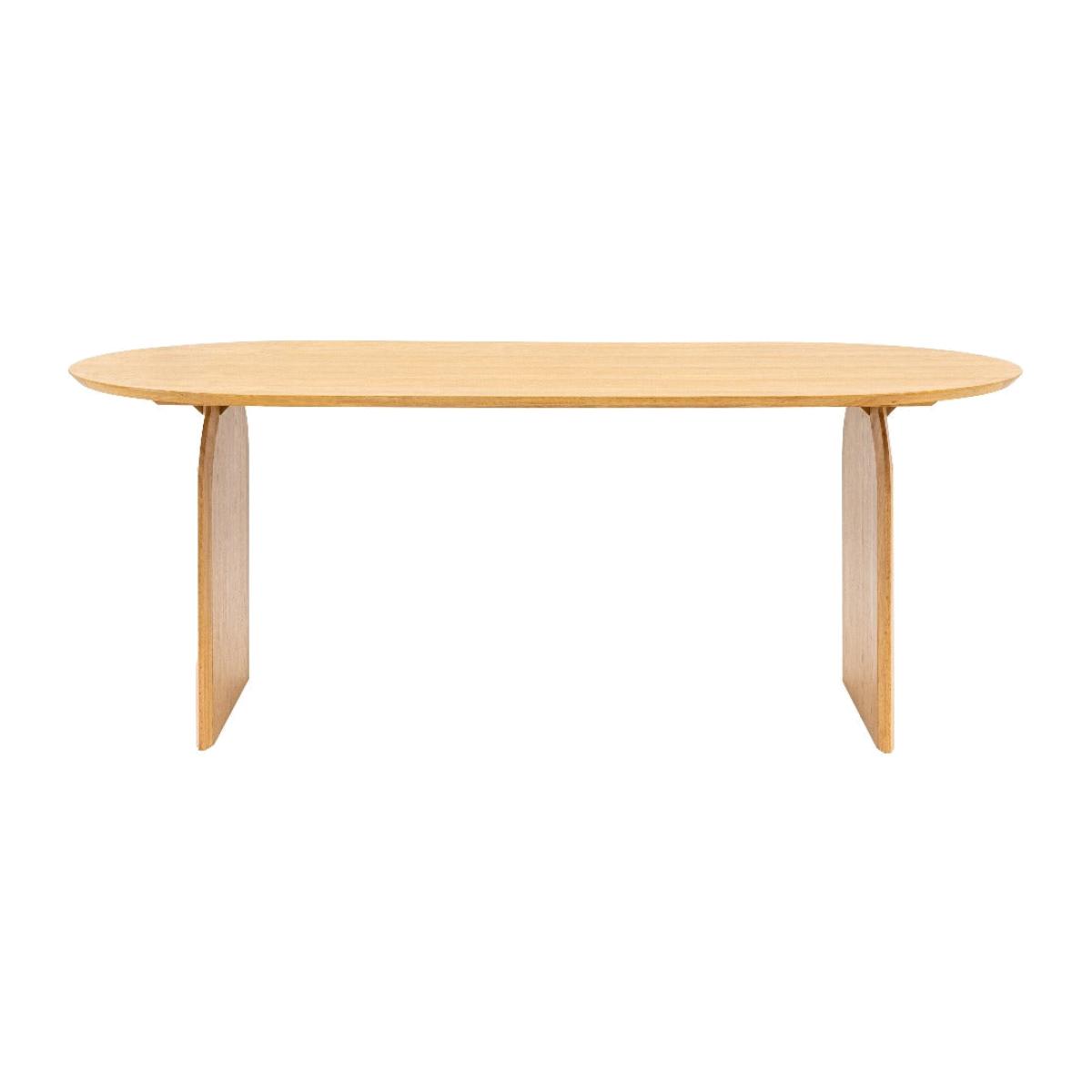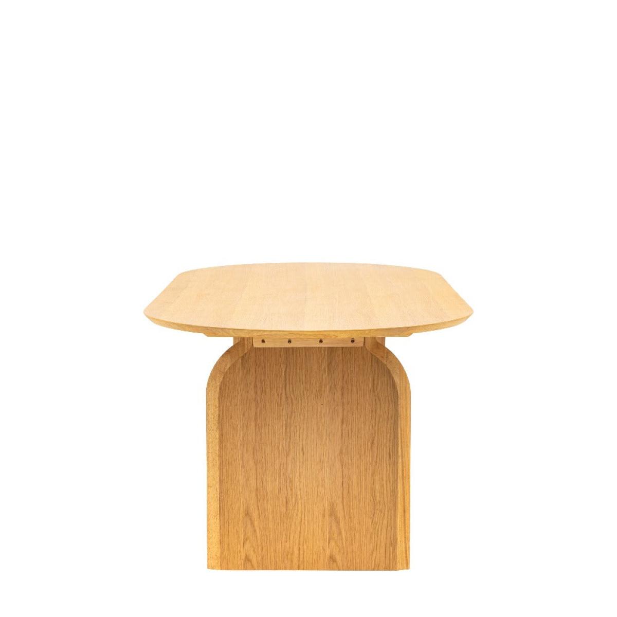 Designed to highlight the use of geometric design, with a nod towards retro style but in a more modern format, this beautiful dining table features a lovely elegant top with curved ends, with this form echoed on the tops of the legs. It is made using oak veneers and solids, where practical, with a natural matt finish. Matching pieces available. Additional Information