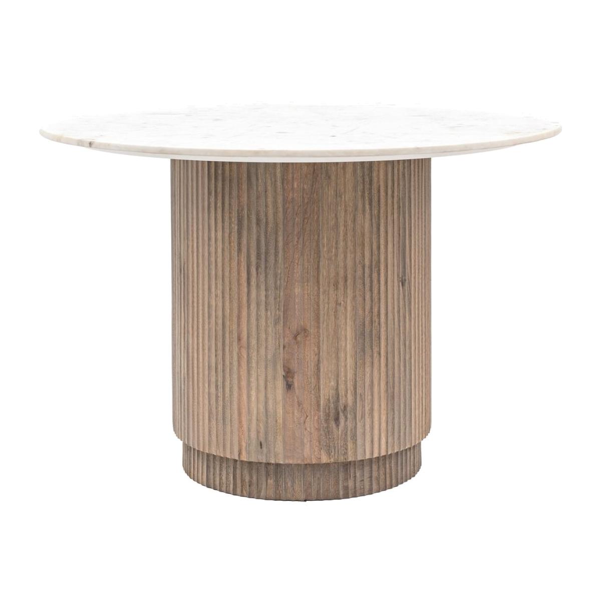 Offering a modern classic look, this stunning dining table exudes timeless quality and beauty. It is crafted from solid mango wood, with a striking vertical ribbed feature on the drum base, and a polished Indian white Carrera marble top with classic grey/blue veins running through it. Matching pieces available. Additional Information: Seats: 4 Assenmbly information: Legs / Feet Only Shape: Round Clearance to Floor: 73cm Leg Height: 73cm Dimensions:H:75 x W:110 x D:110cm Materials: Mango Wood 60% / Marble 40% Assembly Required: Yes Care Instructions:Wipe clean with a soft dry cloth - no harsh abrasives