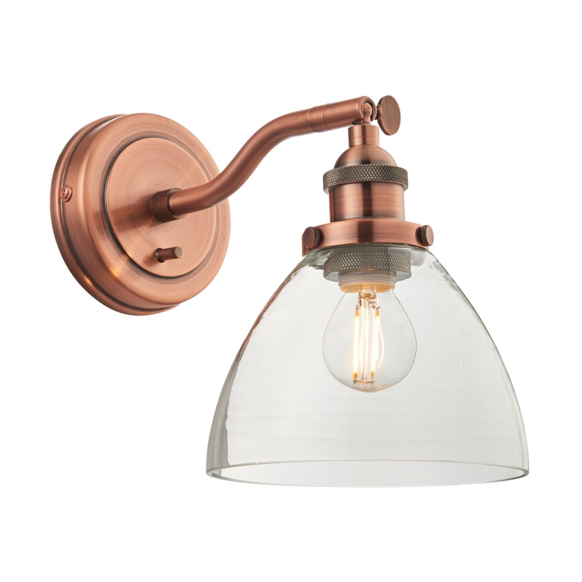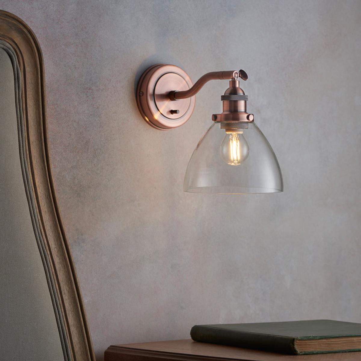 An authentic 'resto' style adjustable wall light, finished in aged copper plating with authentic knurled lamp holder details and clear glass shades. Featuring an adjustable knuckle and accessible on/off switch, pair this wall light with filament LED lamps for that perfect industrial style. The perfect addition for today's stylish homes to create that on trend bar, bistro look.