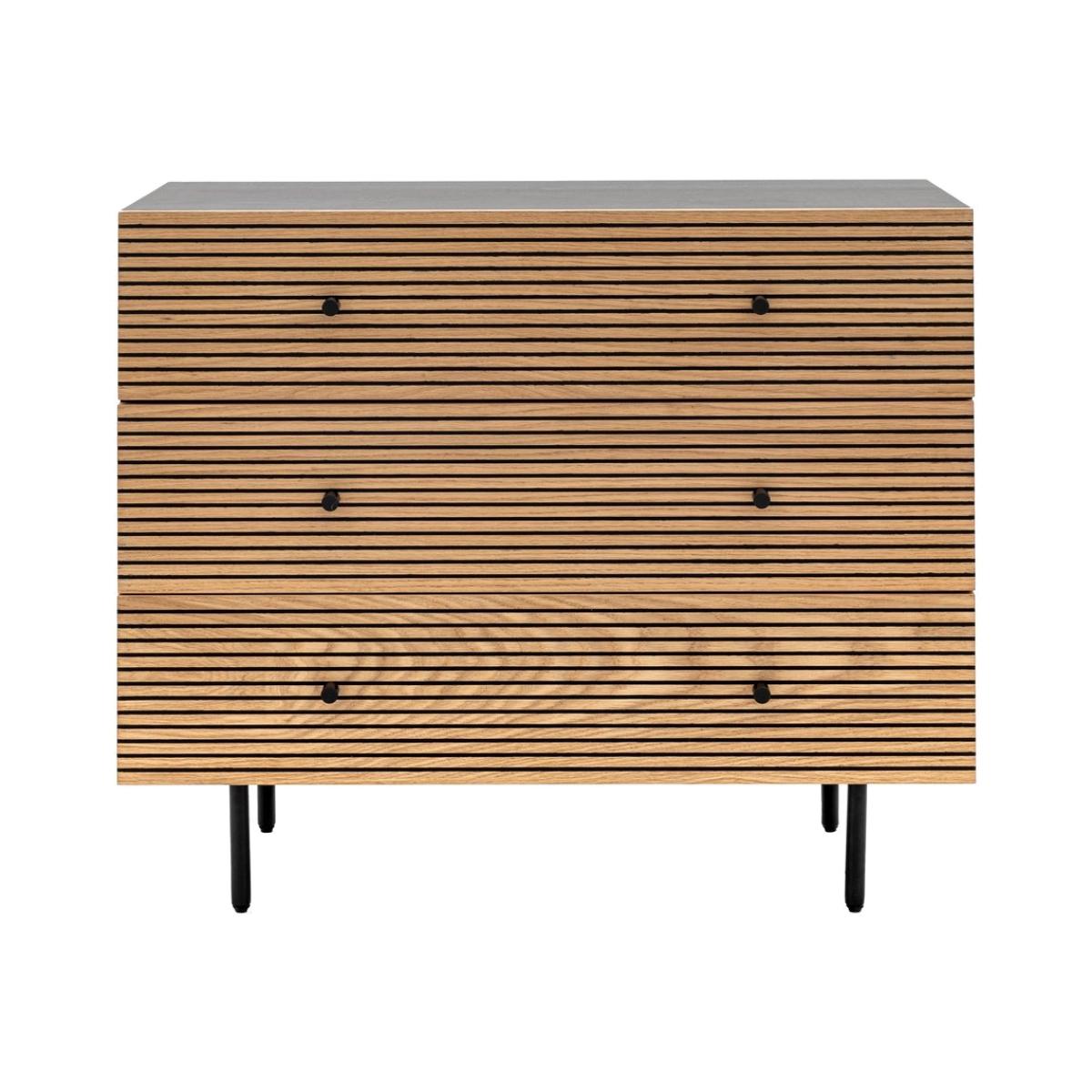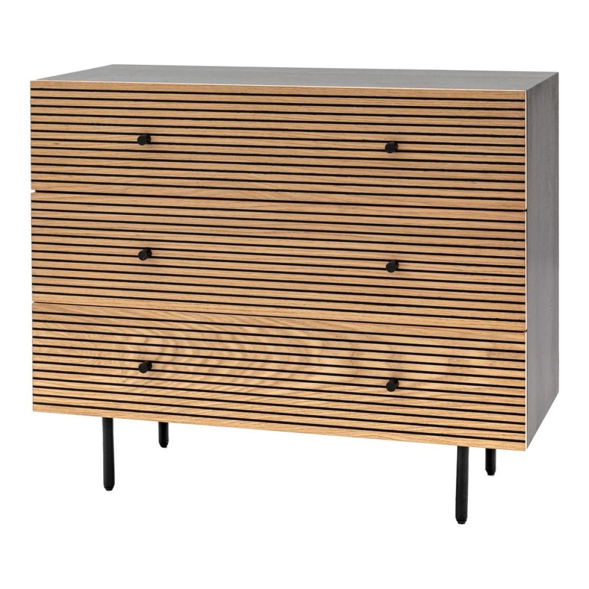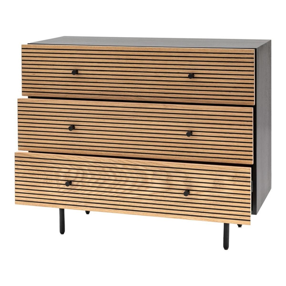 Add a contemporary look to a room with this stylish chest of drawers. The carcase has a black finish with a pressed woodgrain effect to create a premium look. The drawer fascias are real oak woodgrain veneer with a feature black line pattern. A black metal underframe and drawer handles complete the look. Matching items available Additional Information