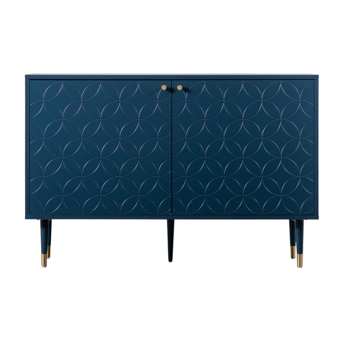 Add an eye-catching feature piece to a room with this stunning blue two door cabinet. The unit combines colour and shape to great effect, with a routed geometric circular pattern on the doors which has a hint of Bauhaus influence. Brass handles are complemented by brass ‘socks’ on the painted solid oak legs. The cabinet is also available in three other colours, and there are matching and coordinating pieces. The cabinet is part of a collection of living furniture which is from our Packed-Flat Design Project, offering easy delivery to any room in any property, whilst reducing the packaging needed. Easy assembly is required, but all the tools needed are supplied. Additional Information