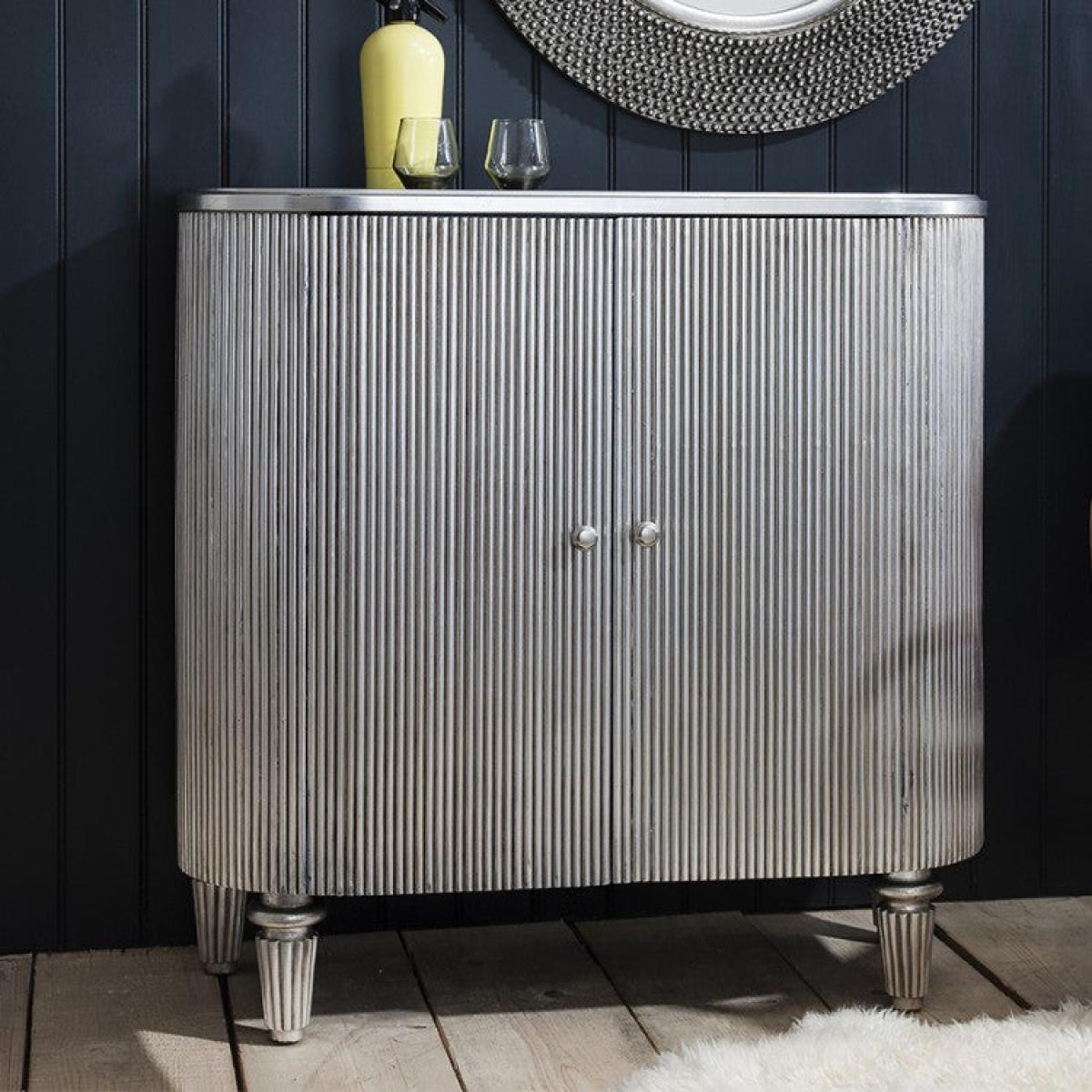 Gallery Jeeves Drinks Cabinet, from Olivia's. Brings new heights of elegance to your home and a hint of retro-inspired design, with the stylish Jeeves drinks cabinet. Detailed with fine reeded lines that are beautifully hand gilded in a silver leaf finish, its contrasting black interior and mirrored back panel create a palette of sleek, glamorous design. Perfect for creating a party atmosphere, this Jeeves cabinet is perfect for bringing your dining space to life with a unique addition. Dimensions: W: 97 x D: 41 x H: 96 cm. Material: Glass, Mahogany, MDFMirrored Back