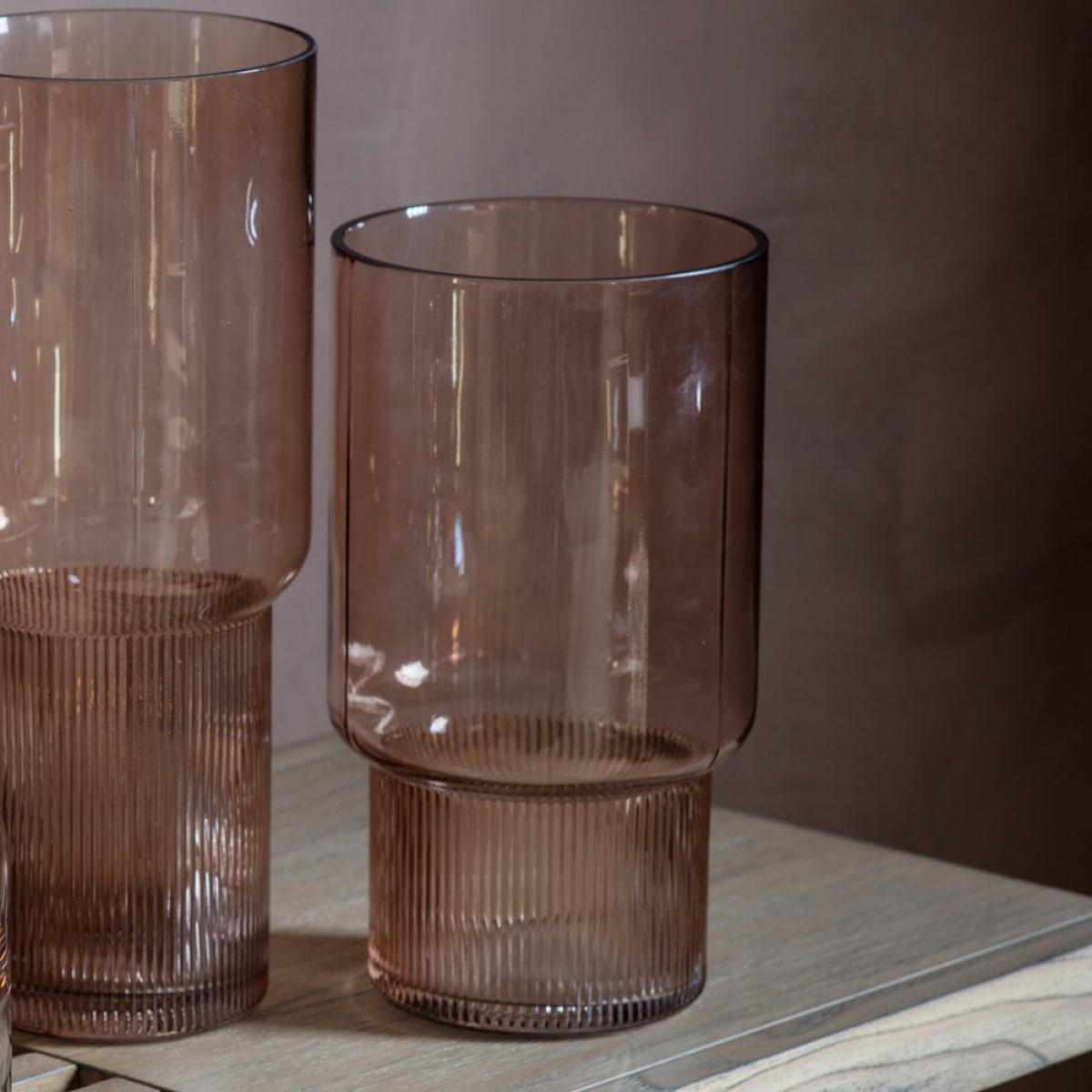 The Imogen Vase features a contemporary design with a smooth top section and ridged bottom area, which catches the light to add interest. Use on its own or paired with the larger Imogen Vase.
