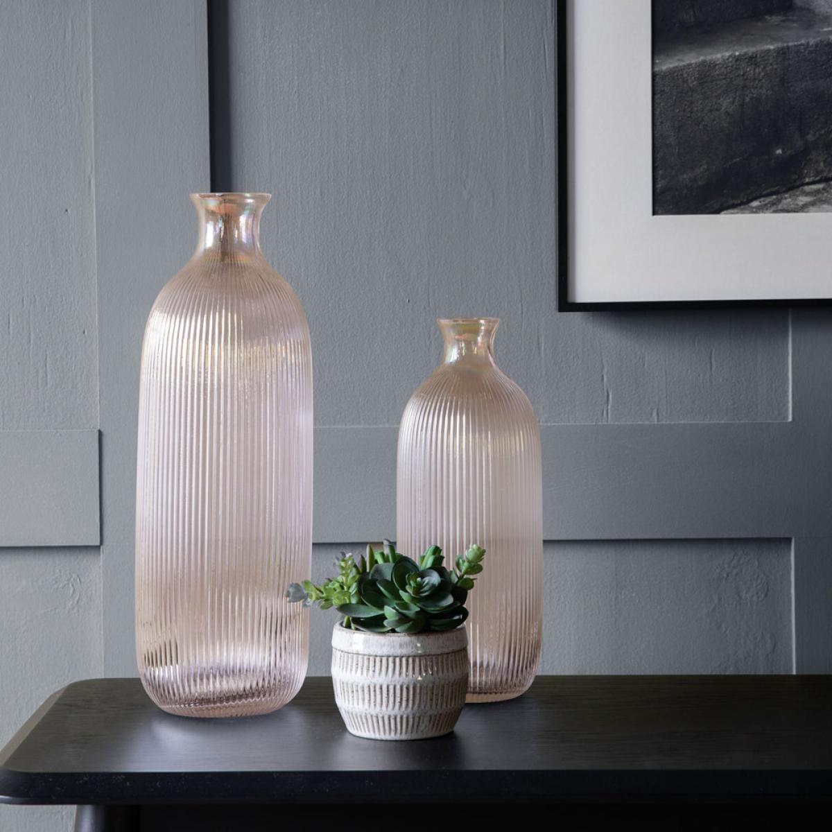 Lovely vase offering a bottle-style shape which is ideal for displaying a single stem. The ribbed texture is highlighted by the clear lustre finish which adds shine. A smaller version is available, and both sizes are offered in a soft pink hue. Use individually, of group together. *Moot Trading Ltd is not a lender and acts only as an introducer. The credit product is provided by Klarna Bank AB (publ). Credit is only available to permanent UK residents aged 18 and over, subject to status. Terms and conditions apply. Please note that the following products are not regulated by the FCA: Pay in 30 days and Pay in 3 instalments. Read More.
