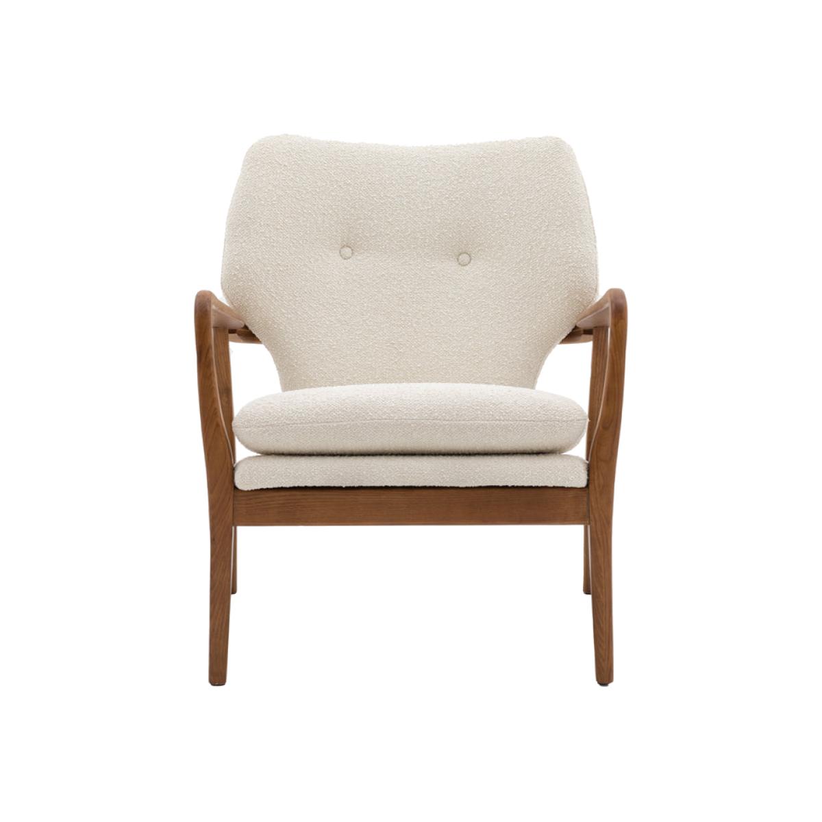 This remarkable Mid-Century style chair features an elegantly shaped solid ash wood frame which makes it a stand out piece in any interior. It is upholstered in cream natural linen with button details and a soft cushion for comfort. Dimensions: H: 85 x W: 73 x D: 74 cm Materials: Oak, Plywood, Polyester, Foam, Polyfibre Assembly Required: No Care Instructions: Spot clean only. No harsh abrasives or cleaners