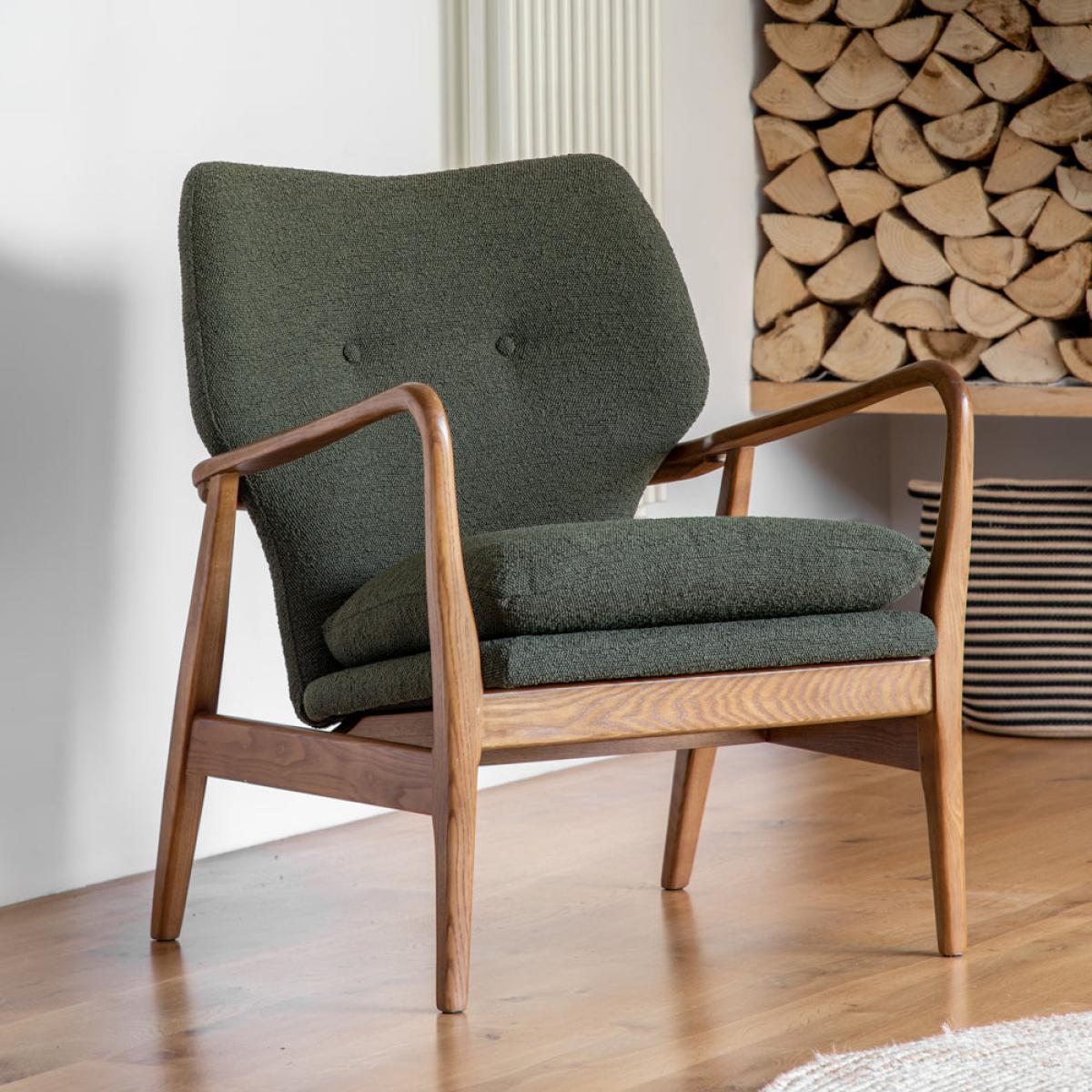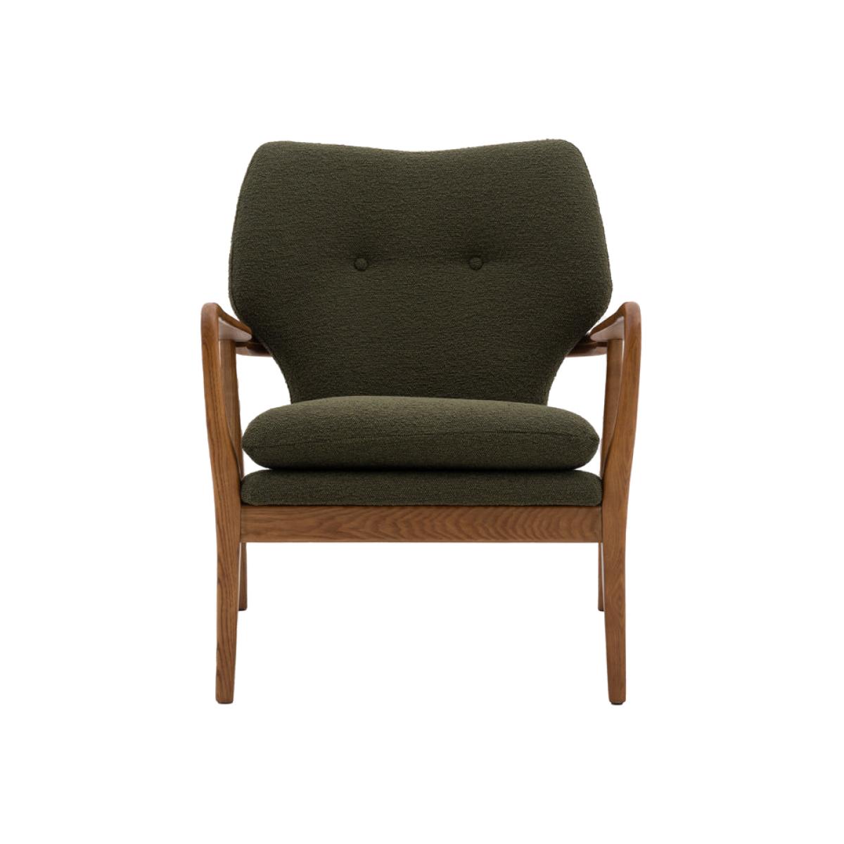 This remarkable Mid-Century style chair features an elegantly shaped solid ash wood frame which makes it a stand out piece in any interior. It is upholstered in green natural linen with button details and a soft cushion for comfort. Dimensions: H: 85 x W: 73 x D: 74 cm Materials: Oak, Plywood, Polyester, Foam, Polyfibre Assembly Required: No Care Instructions: Spot clean only. No harsh abrasives or cleaners