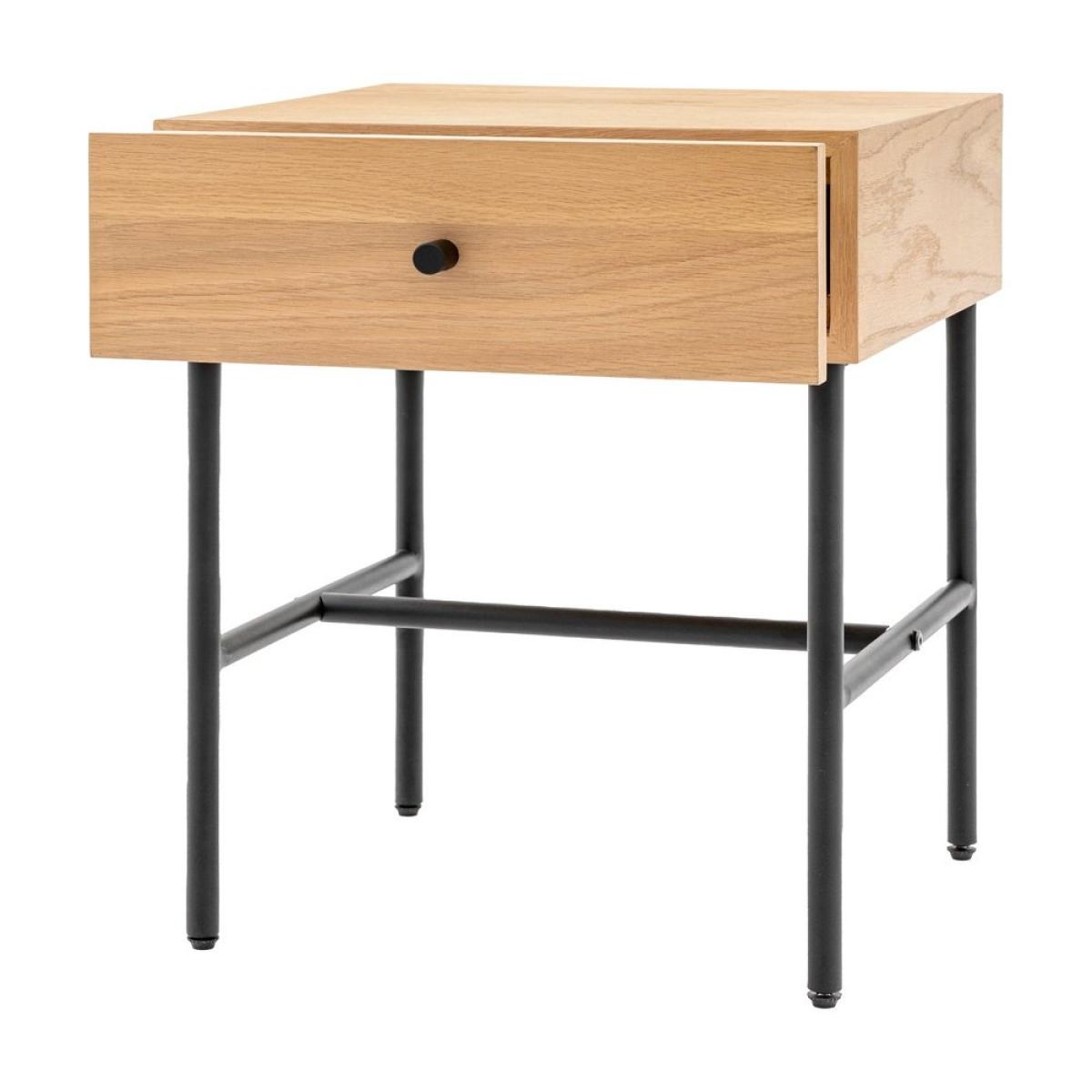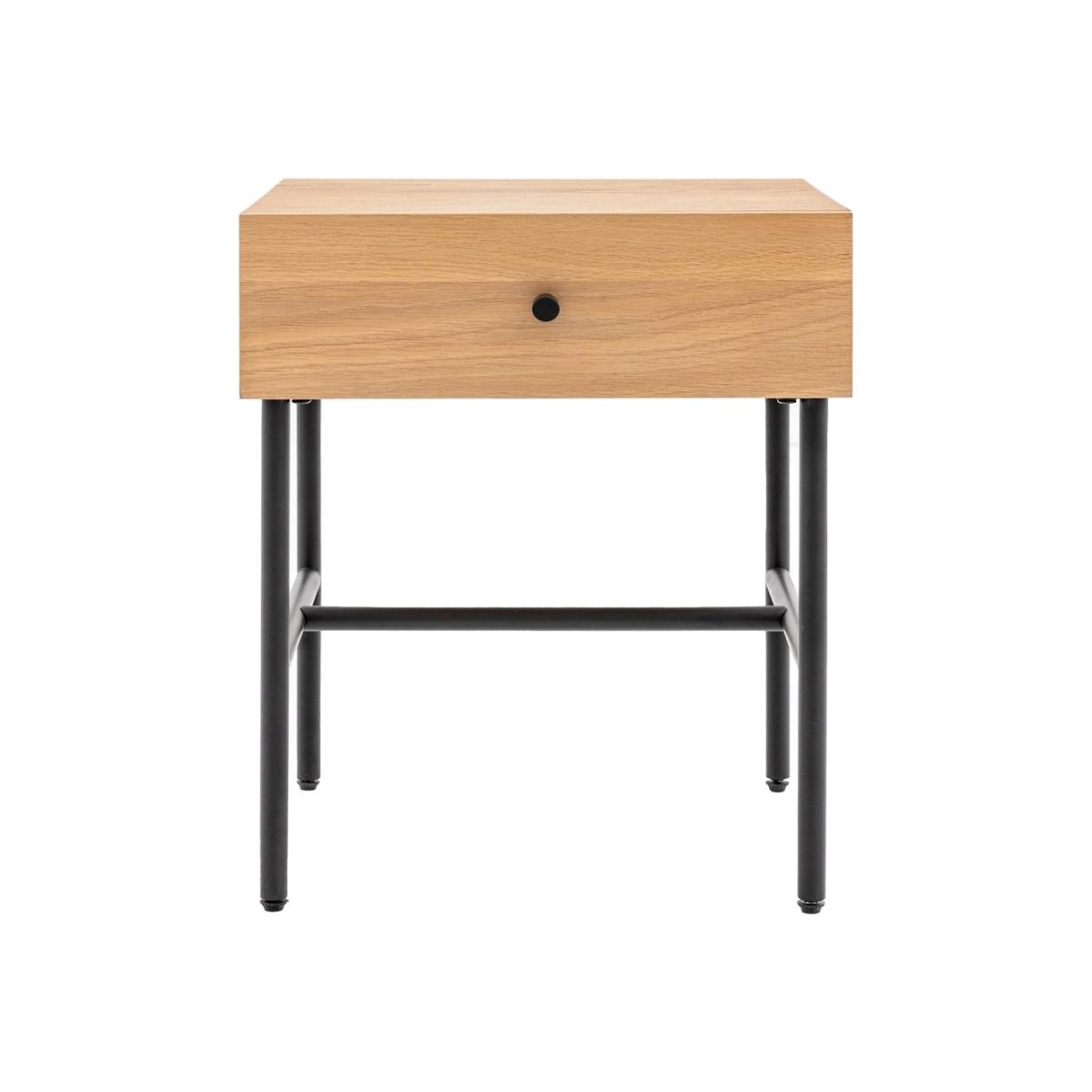 This contemporary bedside, with its practical drawer, is crafted using oak veneers paired with a black metal underframe and drawer handle. The natural wood veneer, with its unique random knots, has been selected to give a modern rustic style. Matching pieces available. Additional Information
