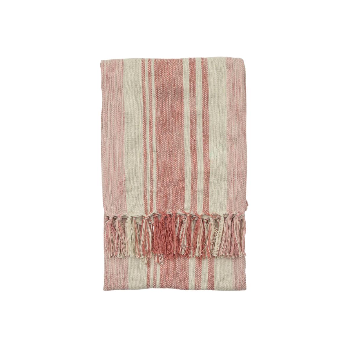 This charmingly rustic fringed striped throw will jazz up even the plainest sofa, bed, or armchair. This throw comes in three attractive colour ways to suit any space. The faded open-weave style references quaint rural nostalgia by giving the piece a slightly faded aura and linen-look finish. The classic stripe pattern will go well with most furnishings. This throw is not only beautiful but sustainably made too. It is made from recycled bottles so you can indulge in your interior style update without any guilt. For maximum style coordination, opt for the matching fabric cushions. Dimensions: H: 2 x W: 130 x D: 170 cm. Dimensions: H: 2 x W: 130 x D: 170 cm Materials: 100% Polyester Assembly Required