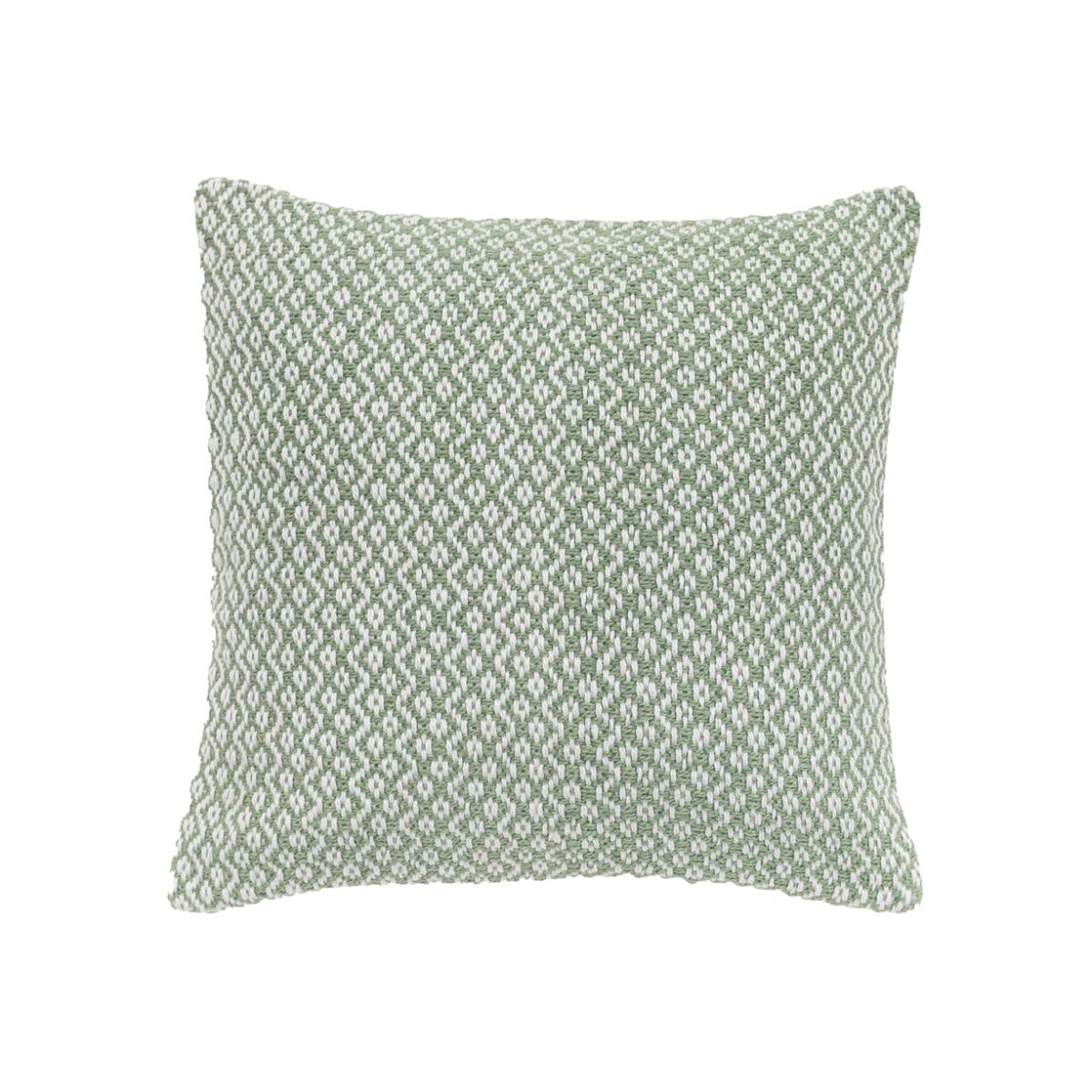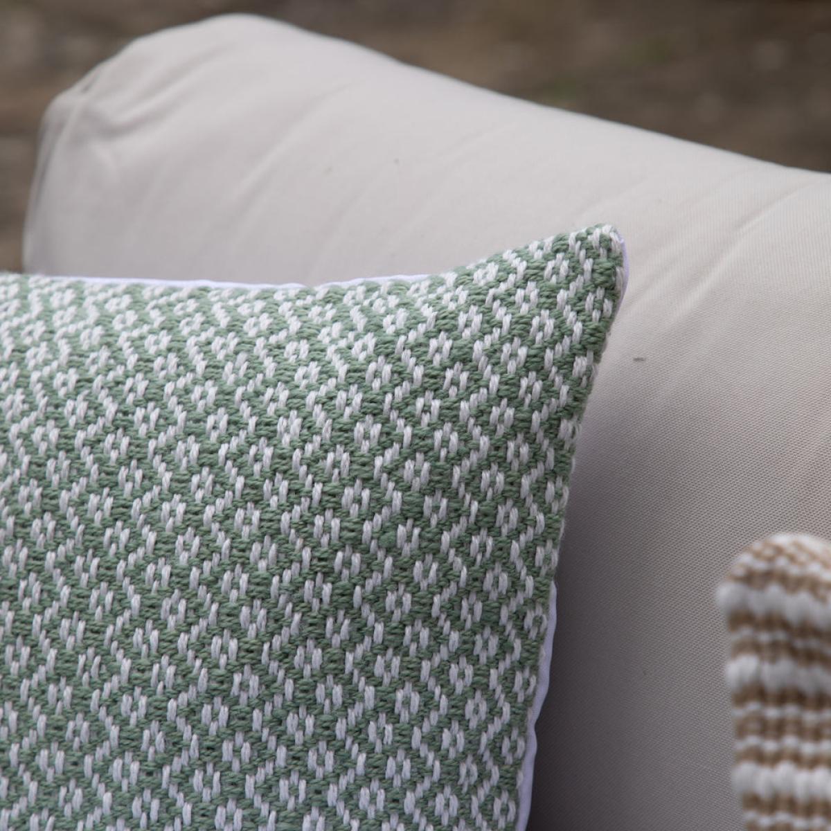 Modern and contemporary cushion cover with a striking geometric pattern. In sage green and white with a plain reverse side, it is finished with a piped trim. Suitable for indoor and outdoor use. Cushion pads sold separately, allowing you to choose from feather-filled or polyester. Dimensions: H: 45 x W: 45 x D: 1 cm Materials: 100% PET with Repellant Lining Assembly Required: No Care Instructions:Machine wash at 30 degrees. Do Not Bleach. Do Not Tumble Dry. Do Not Iron. Do Not Dry Clean