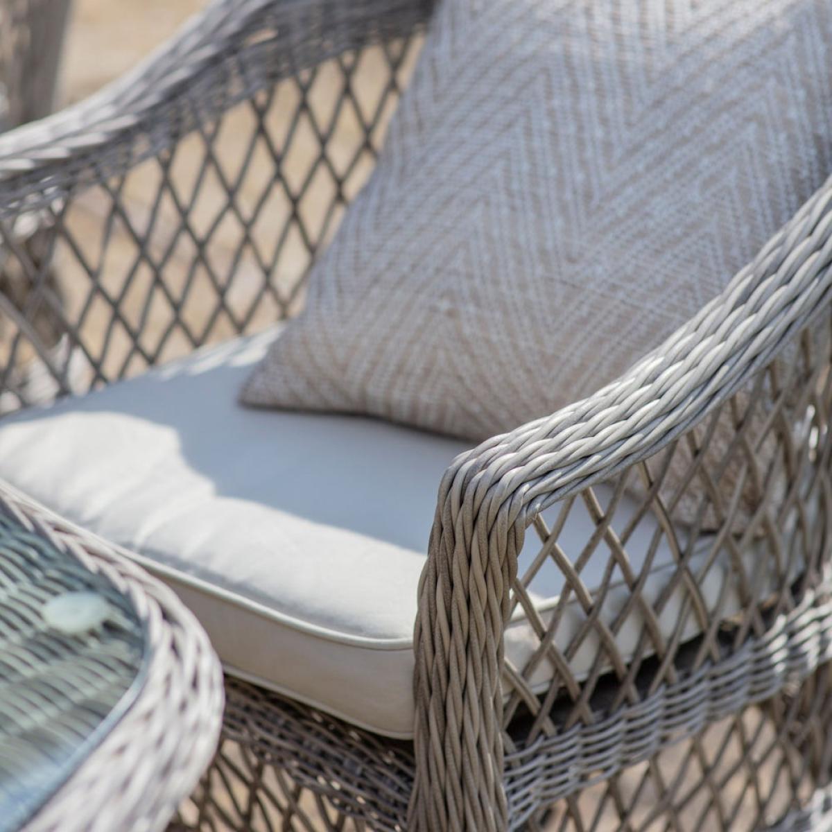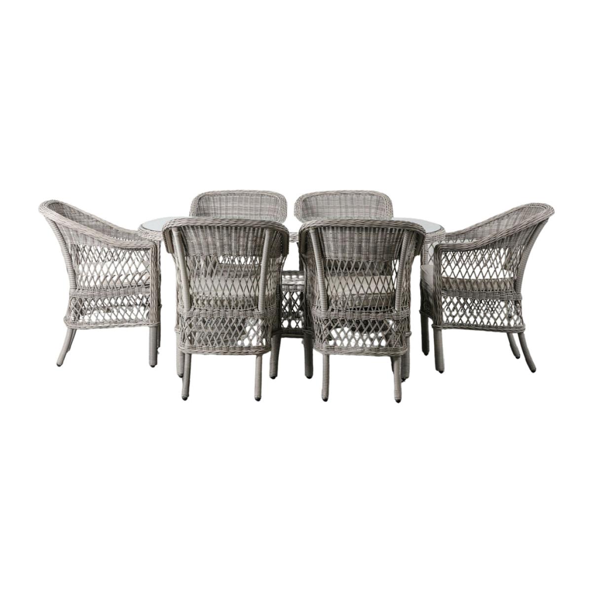 This beautiful 6 Seater Oval Dining Table Set features six dining chairs and a matching dining table. They are crafted from hand woven all weather 5mm PE rattan with a combination of close weave and open weave patterns to give a stylish design in a lovely stone colour. For comfort, the chairs have a luxurious showerproof seat cushion in a soft colour to complement the colour of the rattan. The table has a shelf and a parasol hole and can be used with our crank and tilt parasols. The frame is powder coated aluminium and the table has a tempered glass top. A matching lounger and sofa dining/tea set are also available. Dimensions:Seat Height: 49 x Seat Width: 45 x Seat Depth: 46 cm Materials: Aluminium Frame / Polyester Fabric / Poly Rattan / FR Foam / Polyester Fibre Assembly Required:Yes