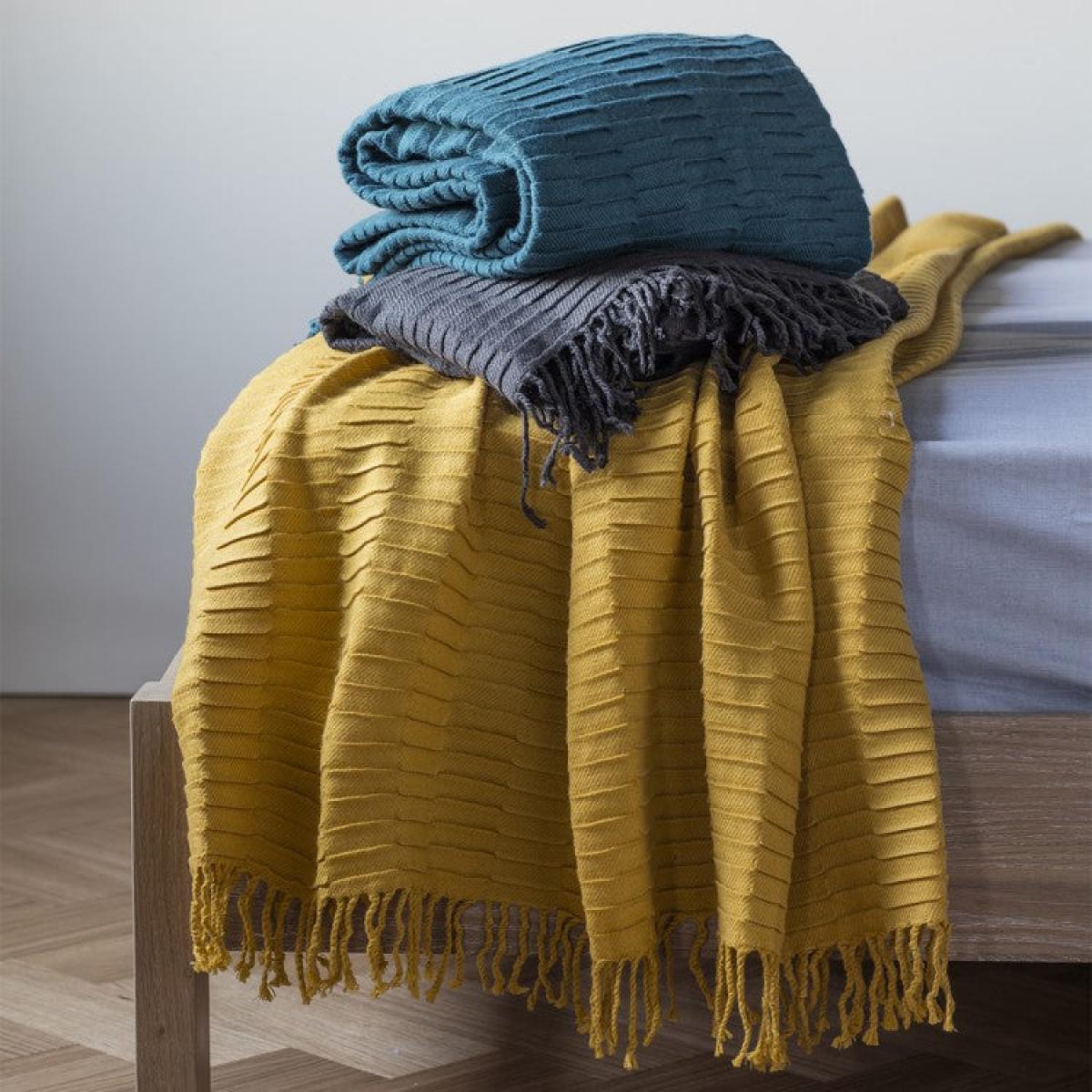 Introduce some sumptuous texture into a luxurious master bedroom or cosy living space with the linear pleat throw from Gallery Direct. Available in a selection of stylish hues suited to a variety. View More. Introduce some sumptuous texture into a luxurious master bedroom or cosy living space with the linear pleat throw from Gallery Direct. Available in a selection of stylish hues suited to a variety of interior styles and colour schemes, these high-quality throws can be draped elegantly over a sofa or armchair, liven up an oversized footstool, or arranged on a plush bed alongside complementary scatter cushions and pillows. From mustard yellow to slate grey and rich aquamarine, the chic tassel detailing gives these versatile throws an additional layer of personality that is certain to make a positive impression in your home.