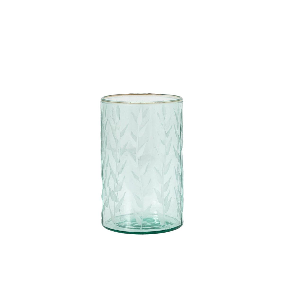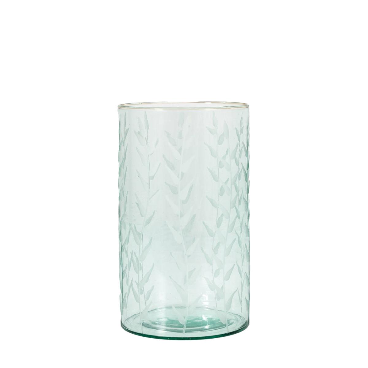 Add some sophistication to your space with this vase. Handmade in pale green recycled glass, the simple shape is adorned by an etched sorrel leaf design. Dimensions: Small - H: 14.5 x W: 12.5 x D: 12.5 cm Medium - H: 20.5 x W: 12.5 x D: 12.5 cm Large - H: 26 x W: 15 x D: 15 cm Materials: Glass Assembly Required: No Care Instructions:Dust with a soft, lint free, clean cloth