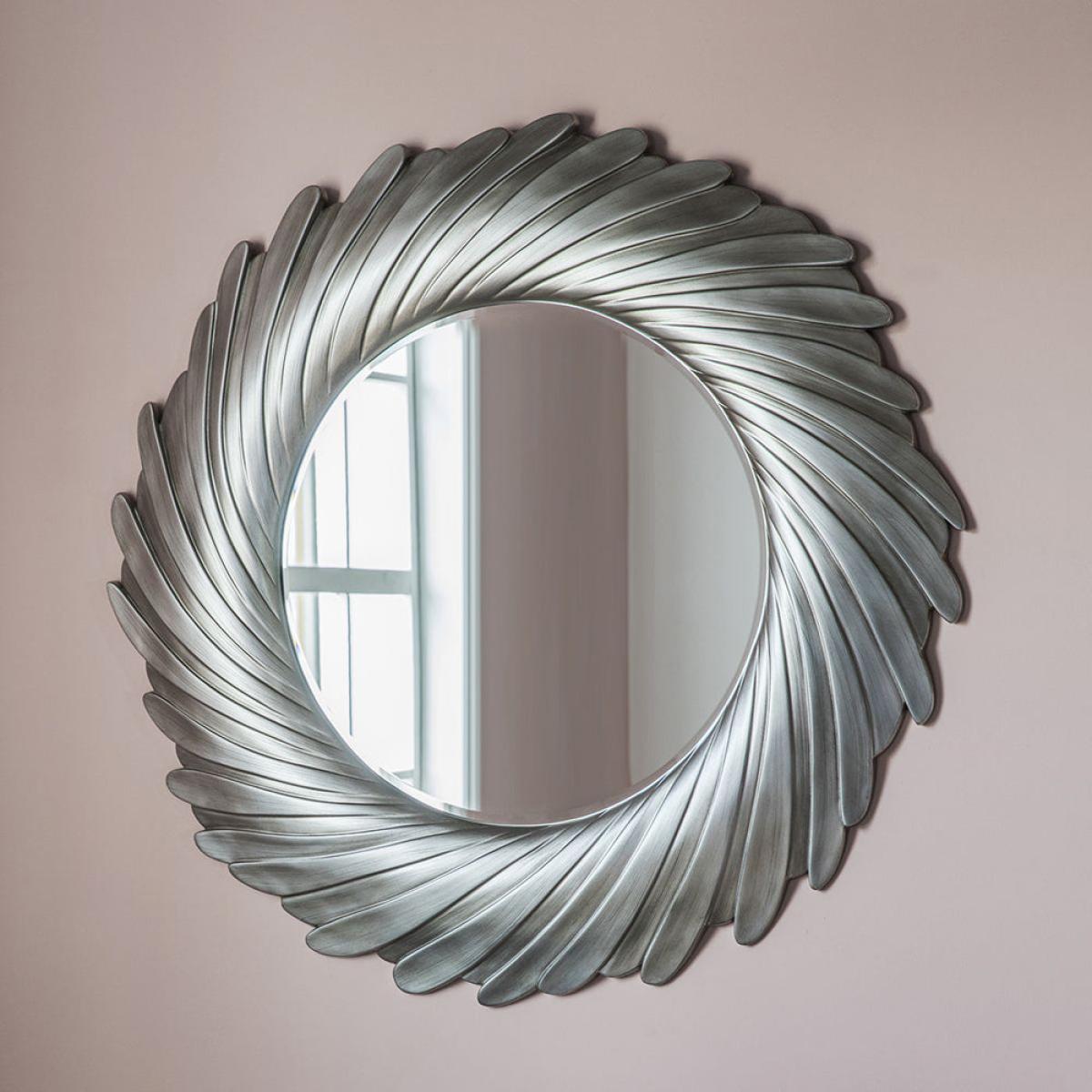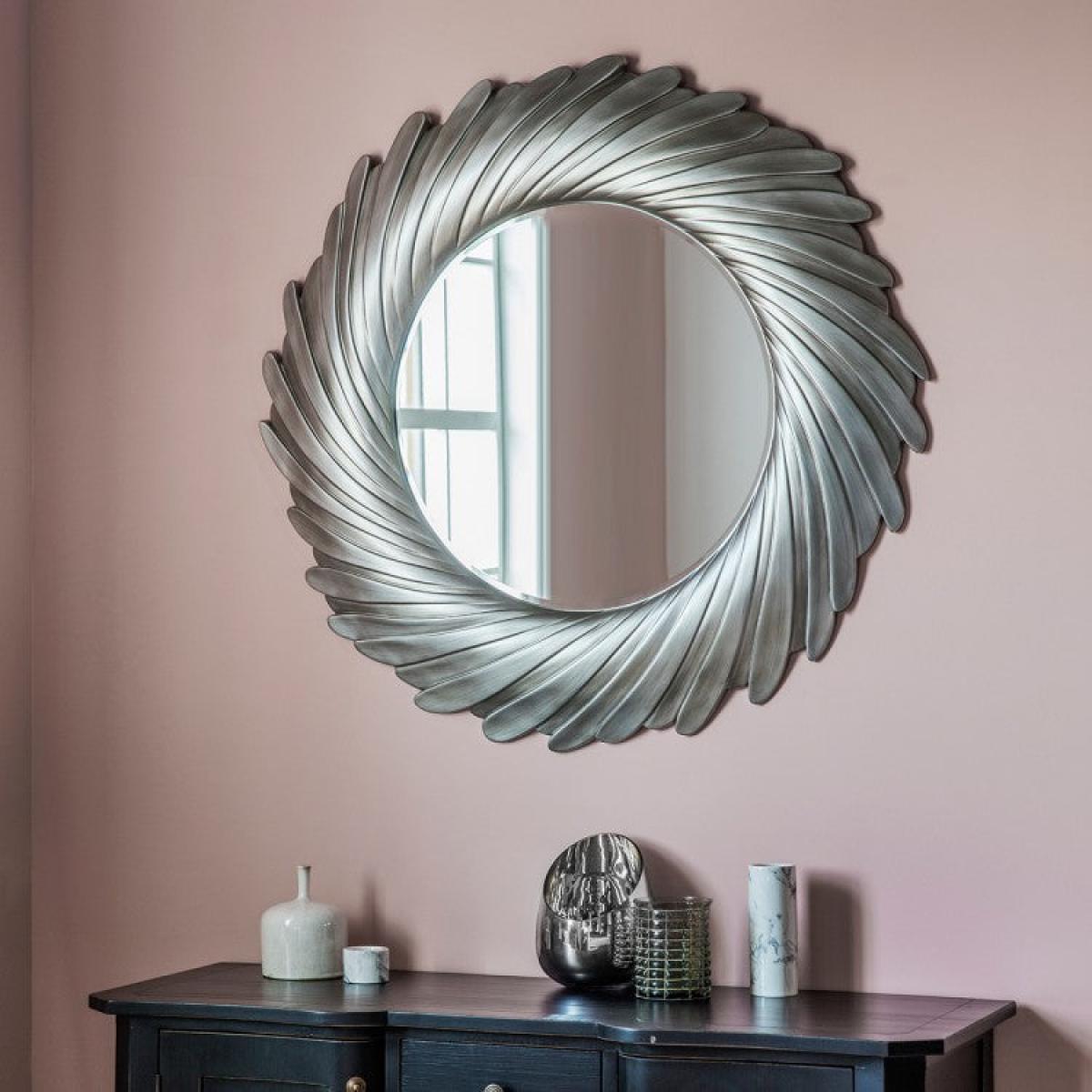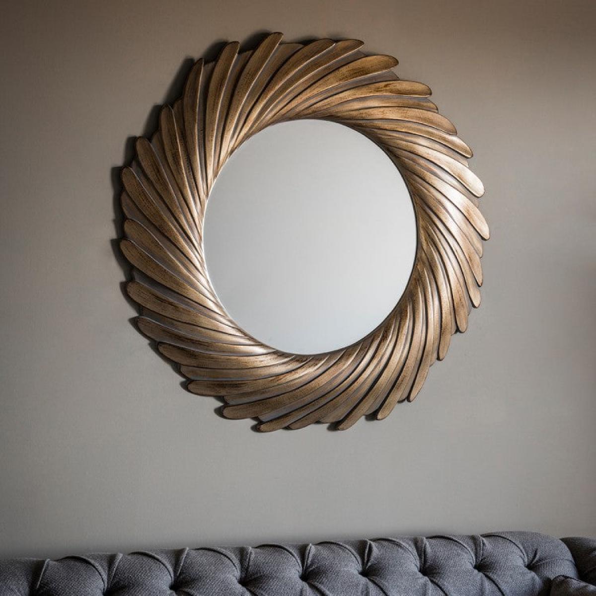 Bring the sunshine into your indoor living space with the Lowry mirror from Gallery Interiors. With its unusual carved metal frame in a swishing spiral design and perfect round shape, the Lowry mirror is a masterpiece of contemporary art. Available in two gorgeous colours - gold verdigree and silver - this stunning mirror is sure to brighten your home and add sparkle to the darkest of corners. Perfect for living rooms, bedrooms, bathrooms and hallways, the Lowry mirror looks particularly good above a mantelpiece or in a hallway to greet guests. Check out the rest of the Gallery Interiors range for extra inspiration! Dimensions: W:100 x H:100 cm