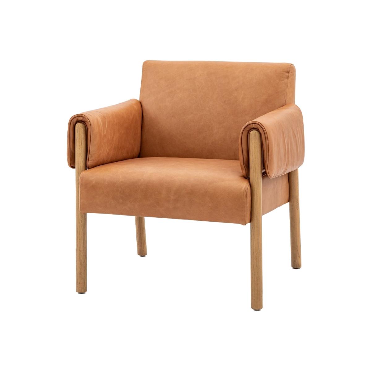 This stunning contemporary armchair is upholstered in lovely brown leather which pairs beautifully with the wooden arms and legs. Adding an unusual, stylish design detail, the wooden arms are wrapped in leather upholstery, adding comfort and style. A matching sofa is available. Additional Information