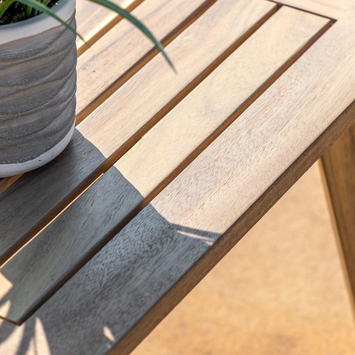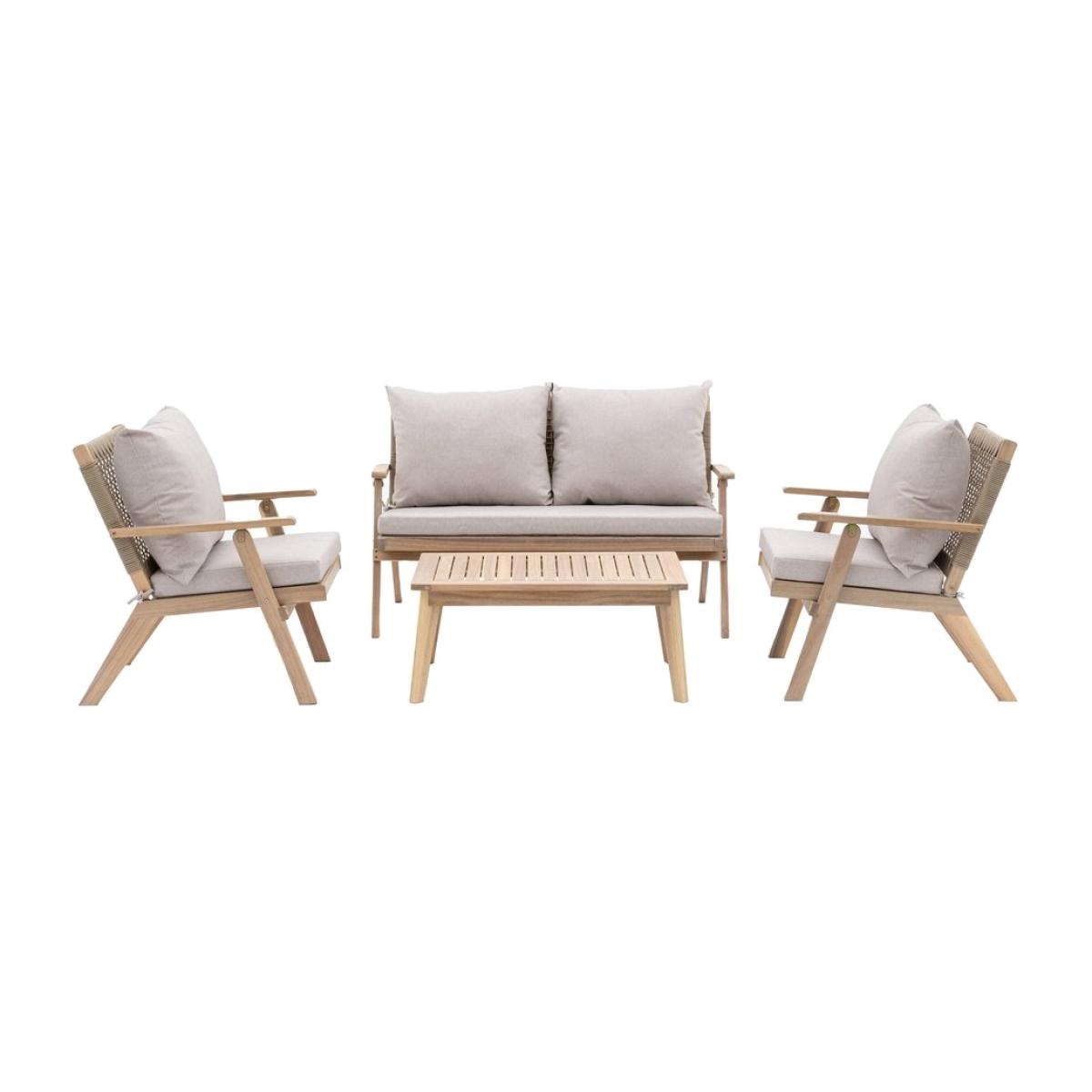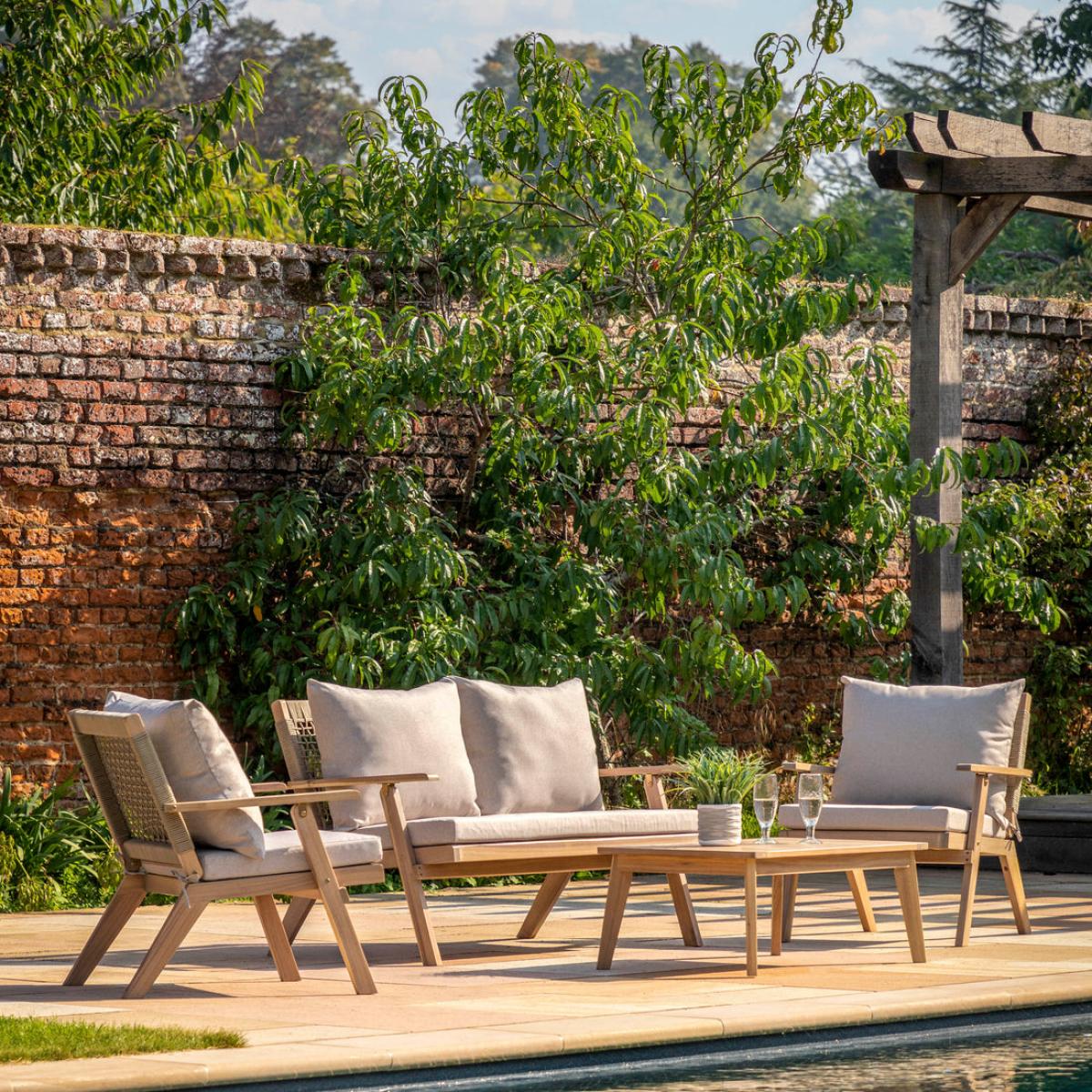 Make the most of your outside space with this stylish lounger set. The 2 seater sofa and 2 armchairs are finished with woven rope backs and grey cushions, the set is completed by a slatted top coffee table, all made from FSC Acacia wood with a beautiful finish. Designed for easy storage both armchairs and the 2 seater sofa fold flat once the cushions are removed. Dimensions:Table: W:80 x D:55 x H:35cm2x Chair: W:64 x D:75 x H:75cm2 Seat Bench: W:124 x D:75 x H:75cm Materials: Acacia 70% / Foam 15% / Rope 10% / Polyester 3% / Fibre 2% Assembly Required: Yes Care Instructions:Wipe clean with a soft, damp cloth. Keep covered when not in use. Colour fading may occur if left in direct sunlight for long periods of time.