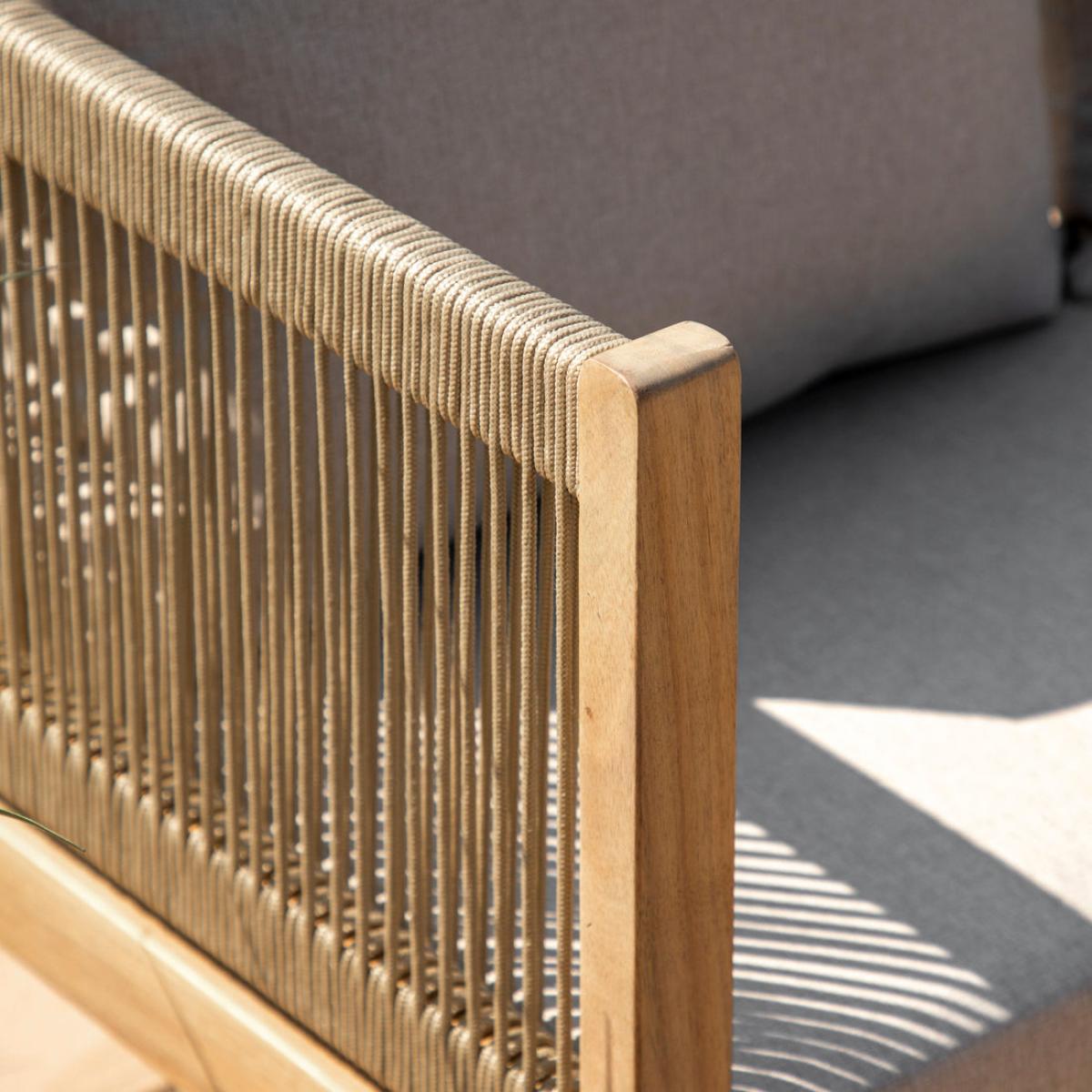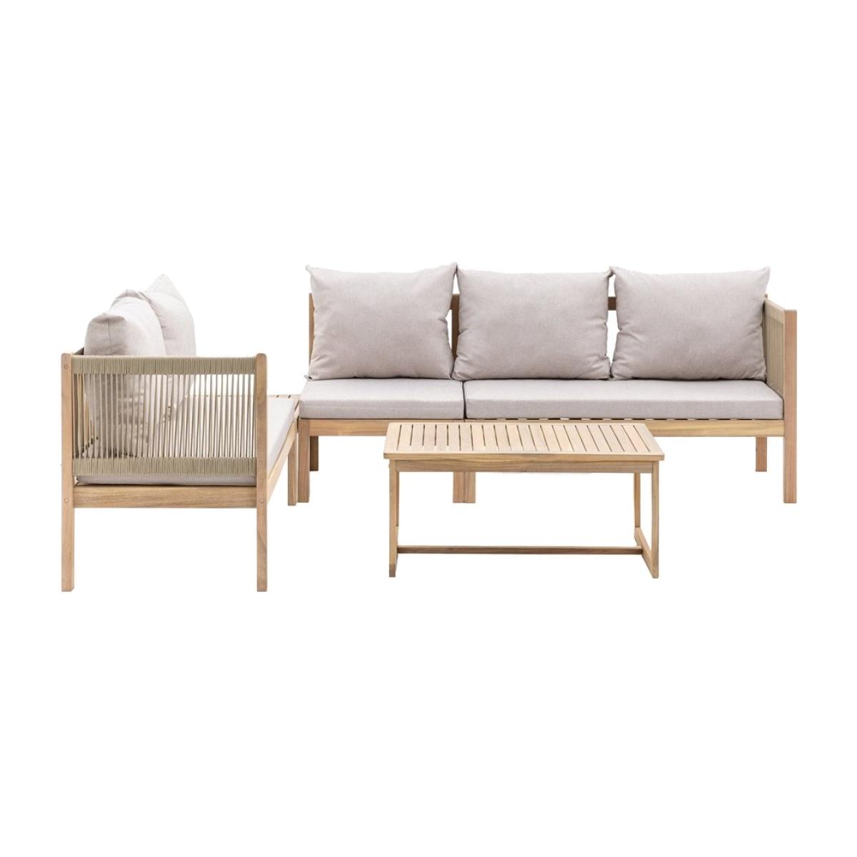 An effortlessly stylish corner sofa set perfect for relaxing in your outdoor space. Comes complete with a slatted top coffee table, stool, single seat unit and two 2 seater one-arm sofas, allowing you to adapt and change your layout as you need. The single unit is able to be swapped out and repositioned as desired. The set is made with oiled finish FSC Acacia wood with stylish rope detail arms and UKFR foam grey upholstered cushions for added comfort Dimensions: Table: W:100 x D:60 x H:37cm2x2 Seater Sofa:W:120 x D:60 x H:70cm1 Seat Sofa: W:60 x D:60 x H:70cm. Stool: W:60 x D:60 x H:30cm Materials: Acacia 70% / Foam 20% / Rope 5% / Polyester 3% / Fibre 2% Assembly Required: Yes Care Instructions:Wipe clean with a soft, damp cloth. Keep covered when not in use. Colour fading may occur if left in direct sunlight for long periods of time.