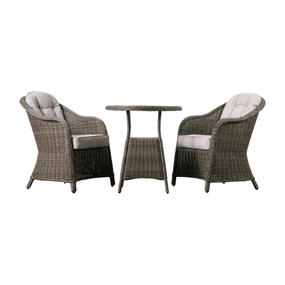 This elegant 2 Seater Bistro Set is crafted from all weather 5mm PE rattan with a hand woven mixed half round/full round weave in a natural finish to give a lovely subtle tone. The two chairs have luxurious showerproof seat and back cushions for comfort, in a soft neutral colour to complement the colour of the rattan. The table top is tempered glass and the frames are powder coated aluminium. The set is also available in a washed grey finish. It is part of a collection of outdoor furniture which offers a great range of pieces, so you can select the ones to suit your requirements. Dimensions:Table: W:69cm x D:69cm x H:75cm. Chair: W:61cm x D:74.5cm x H:83cm Materials: Aluminium Frame / Polyester Fabric / Poly Rattan / FR Foam / Polyester Fibre Assembly Required:Yes Care Instructions:Wipe clean with a soft, damp cloth. Keep covered when not in use. Colour fading may occur if left in direct sunlight for long periods of time.