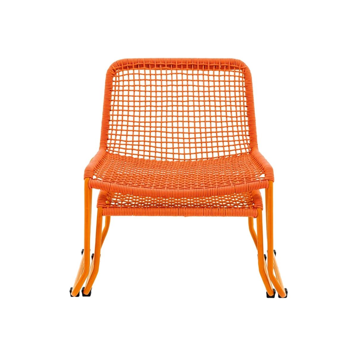 Add a pop of colour and the wow factor to your outdoor space this summer. Sit back and relax in this comfortable bold orange lounger chair and footstool, made with a steel frame with woven outdoor rope seat and back for extra comfort. Dimensions: 1x Chair:W:71.5 x D:71 x H:70cm1x Footstool:W:63.5 x D:55.5 x H:34.5cm Materials: Steel 70% / Rope 30% Assembly Required:Yes Care Instructions:Wipe clean with a soft, damp cloth. Keep covered when not in use. Colour fading may occur if left in direct sunlight for long periods of time.