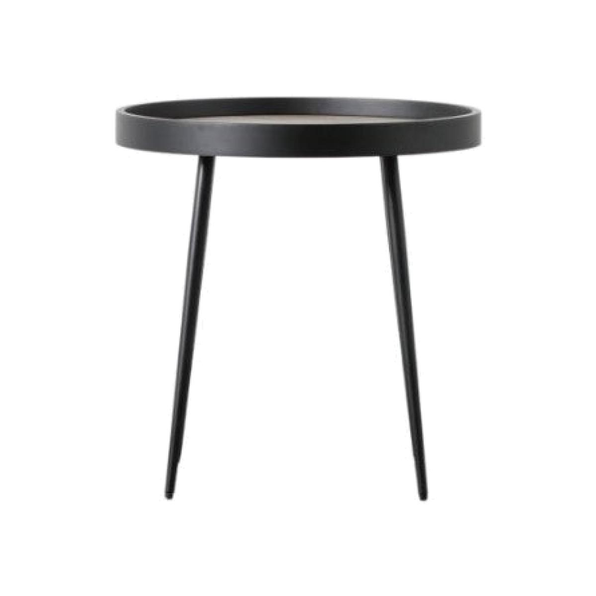 Side table offering a contemporary twist on an industrial look. The legs and frame around the table top are crafted from black metal, whilst the inset top is faux timber. A matching coffee table is available. The tables are part of our Packed-Flat Design Project, offering easy delivery to any room in any property, whilst reducing the packaging needed. Easy assembly is required, but all the tools needed are supplied. Dimensions:W:50 x D:50 x H:50 cm