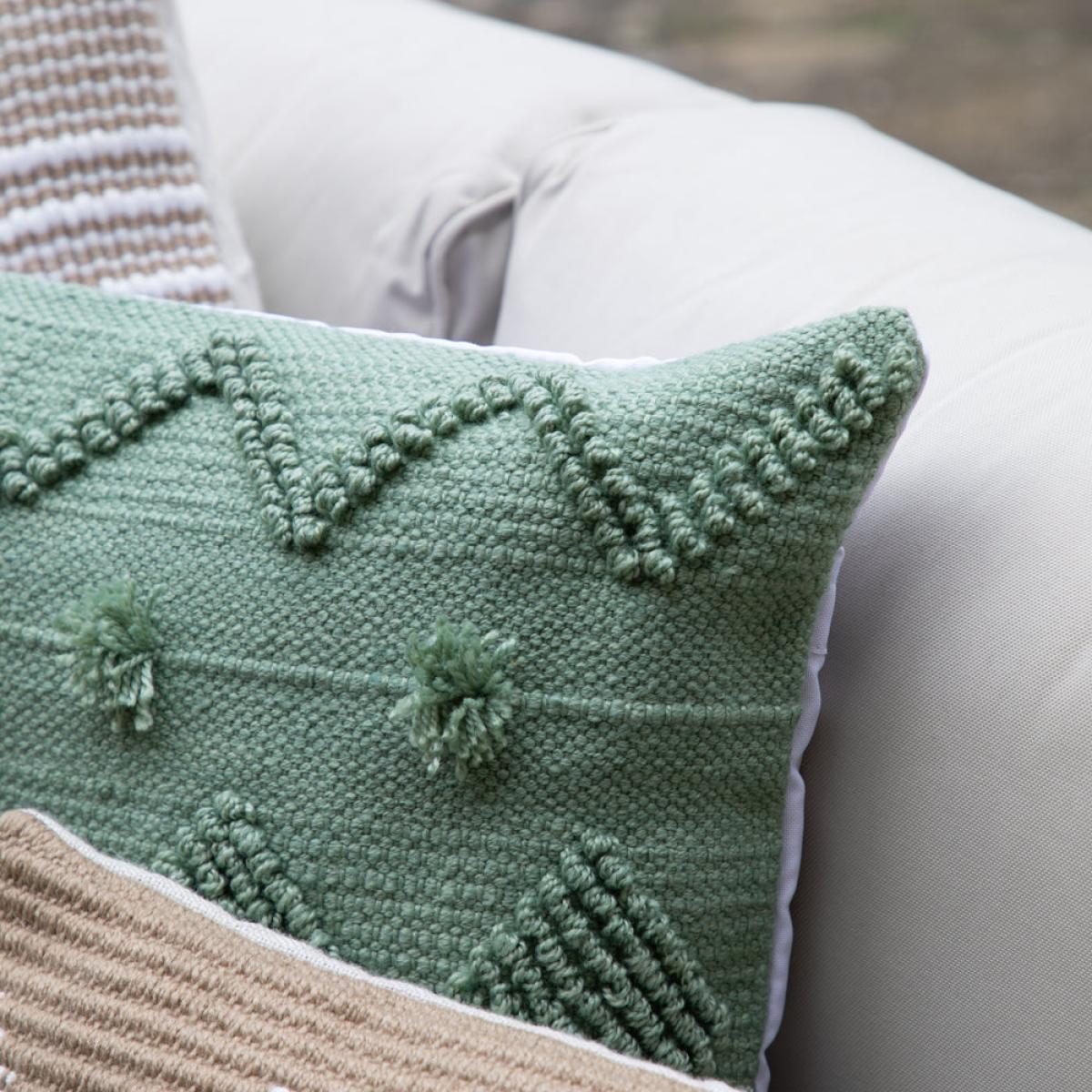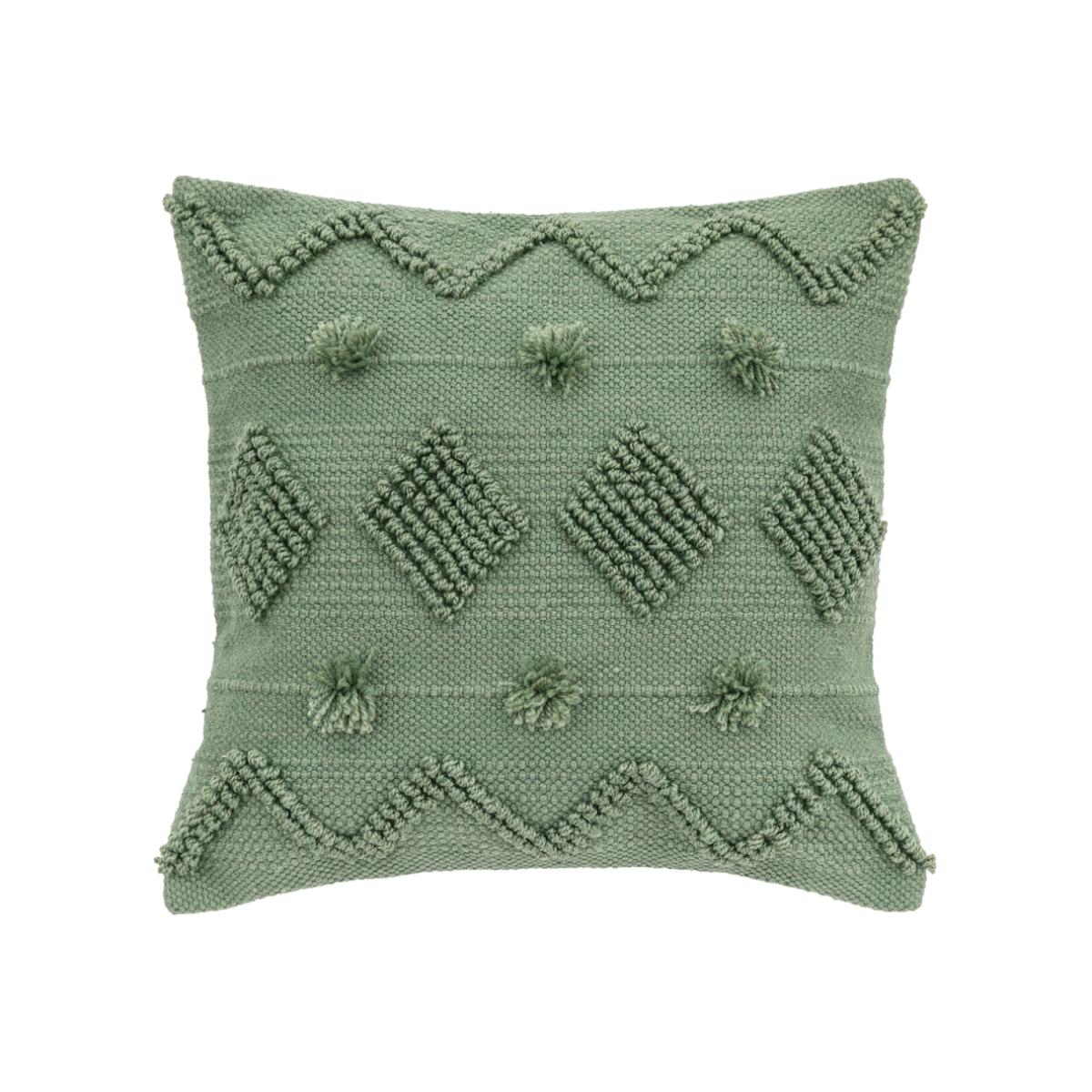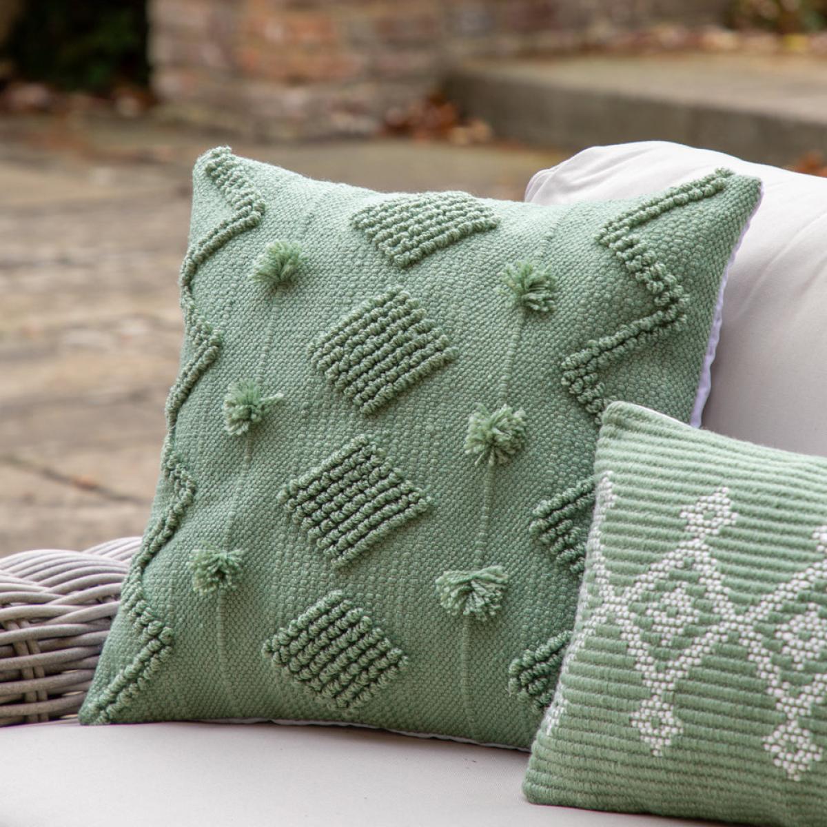Featuring a unique soft tufted diamond pattern in a rich sage green with a plain backing, this textured cushion cover is soft and cosy. Perfect for creating a comfy and relaxing space indoors or outdoors. Cushion pads sold separately, allowing you to choose from feather-filled or polyester. Dimensions: H: 45 x W: 45 x D: 1 cm Materials: 100% PET with Repellant Lining Assembly Required: No Care Instructions:Machine wash at 30 degrees. Do Not Bleach. Do Not Tumble Dry. Do Not Iron. Do Not Dry Clean